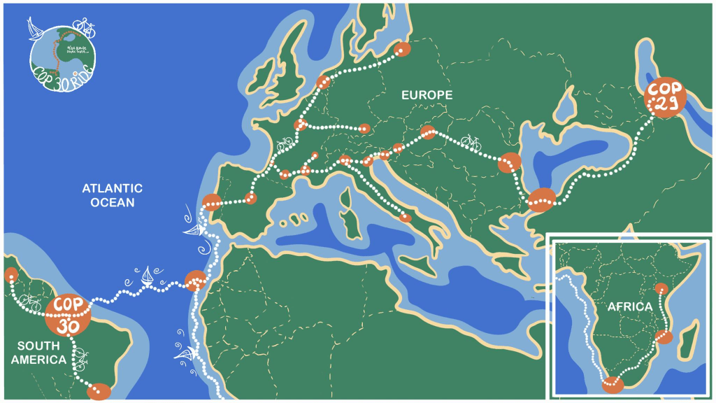 Una marcha en bici que comenzó a mediados de mayo en Bakú (Azerbaiyán), sede de la COP anterior y que, después de recorrer Turquía, los Balcanes, Polonia, Alemania, Países Bajos, Bélgica, Italia y Francia, el 9 de septiembre, entra a España por Hendaya para estar en Madrid el 17 de septiembre.