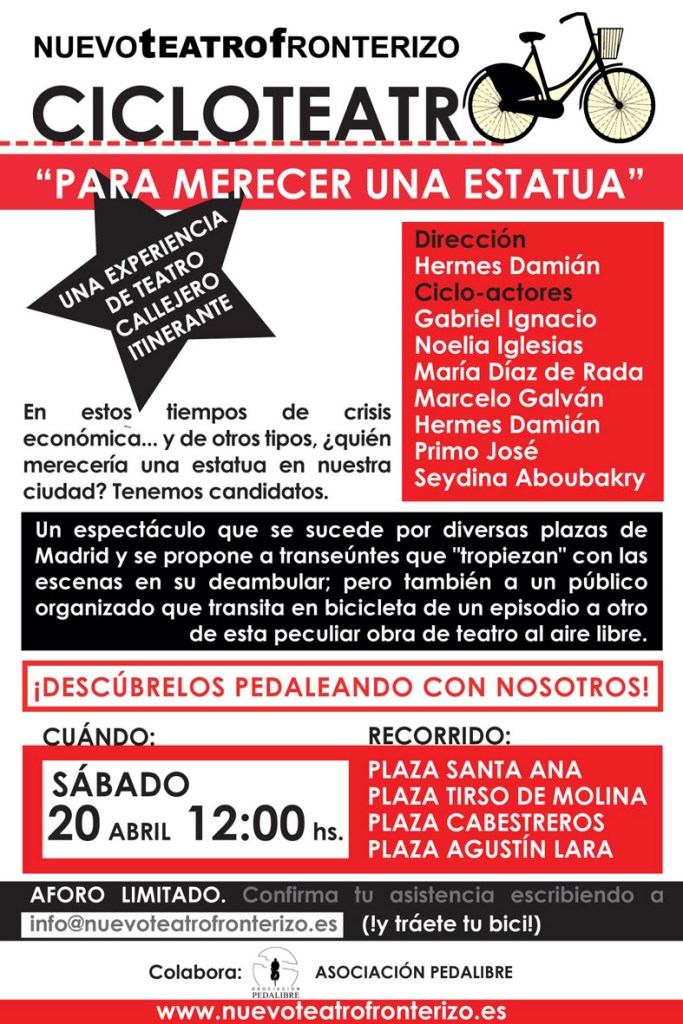 El sábado 20 de abril a las 12 del día, estrenaremos el Cicloteatro, que es un innovador formato de teatro callejero en bicicleta. Los espectadores son ciclistas al igual que los actores y van siguiendo la historia pedaleando entre calles y plazas de la ciudad. Tenemos aforo limitado así que tenéis que apuntaros en una lista a través de mail (escribid a Hermes, toyildo arroba hotmail.com).