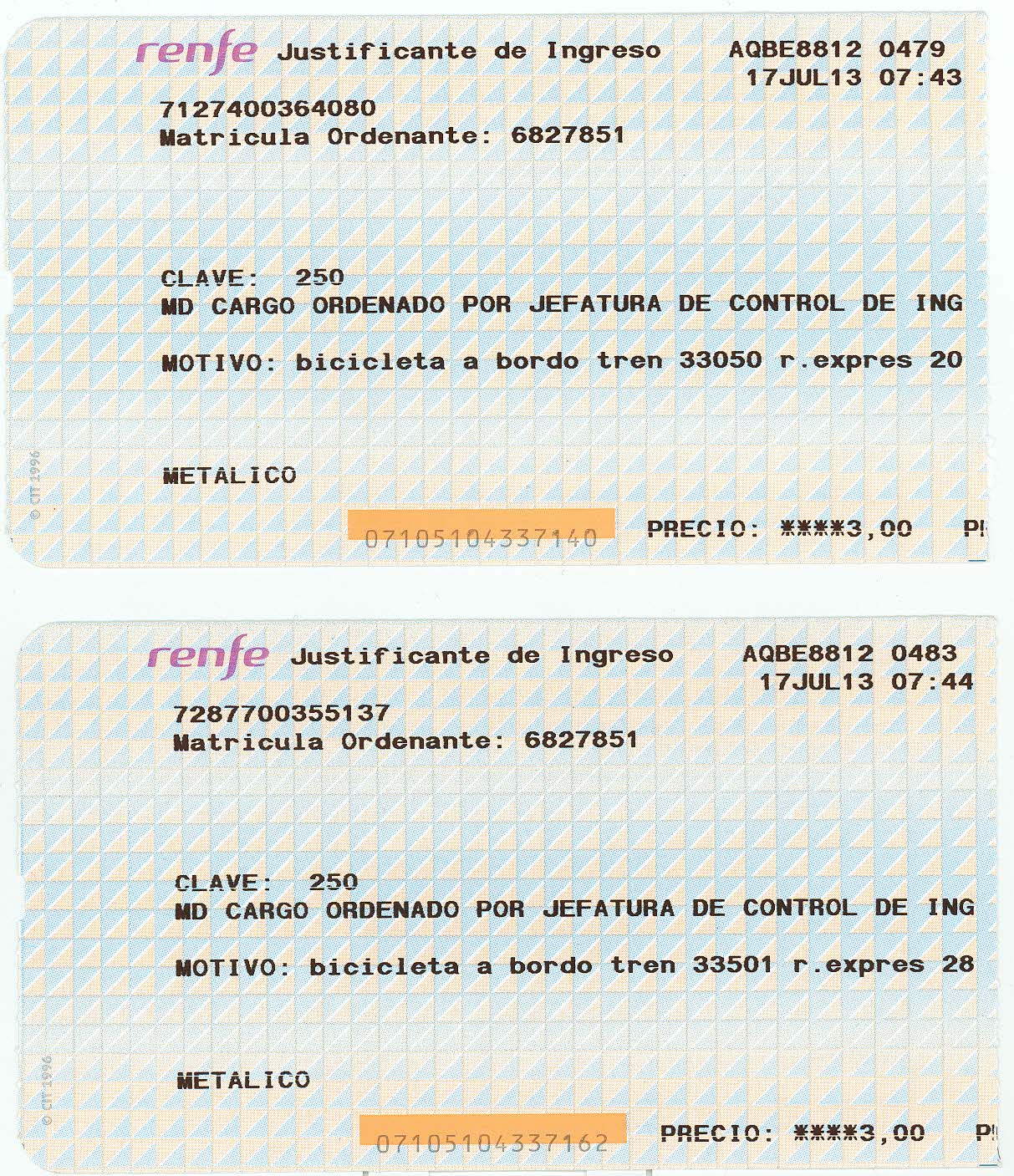 • Día 28 de julio de 2013: Tren regional nº 33501, 8,47 h. (BCN FRANCA a MCHAMARTIN)- 2 bicicletas