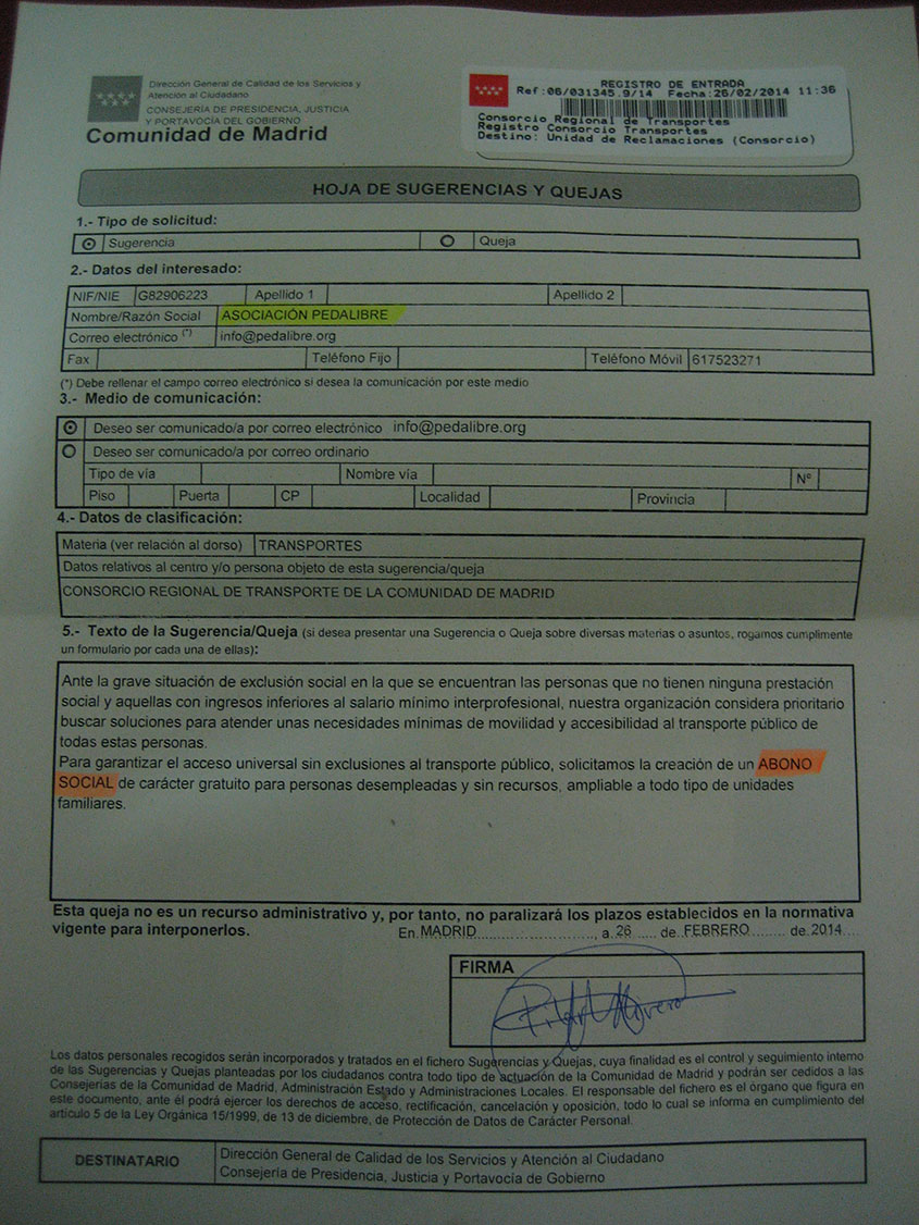En la web de Madrid en Transporte público podéis ver el listado de los colectivos que hemos realizado la reclamación conjunta en el Registro del CRTCM.