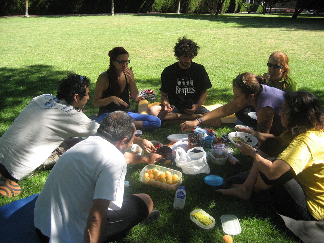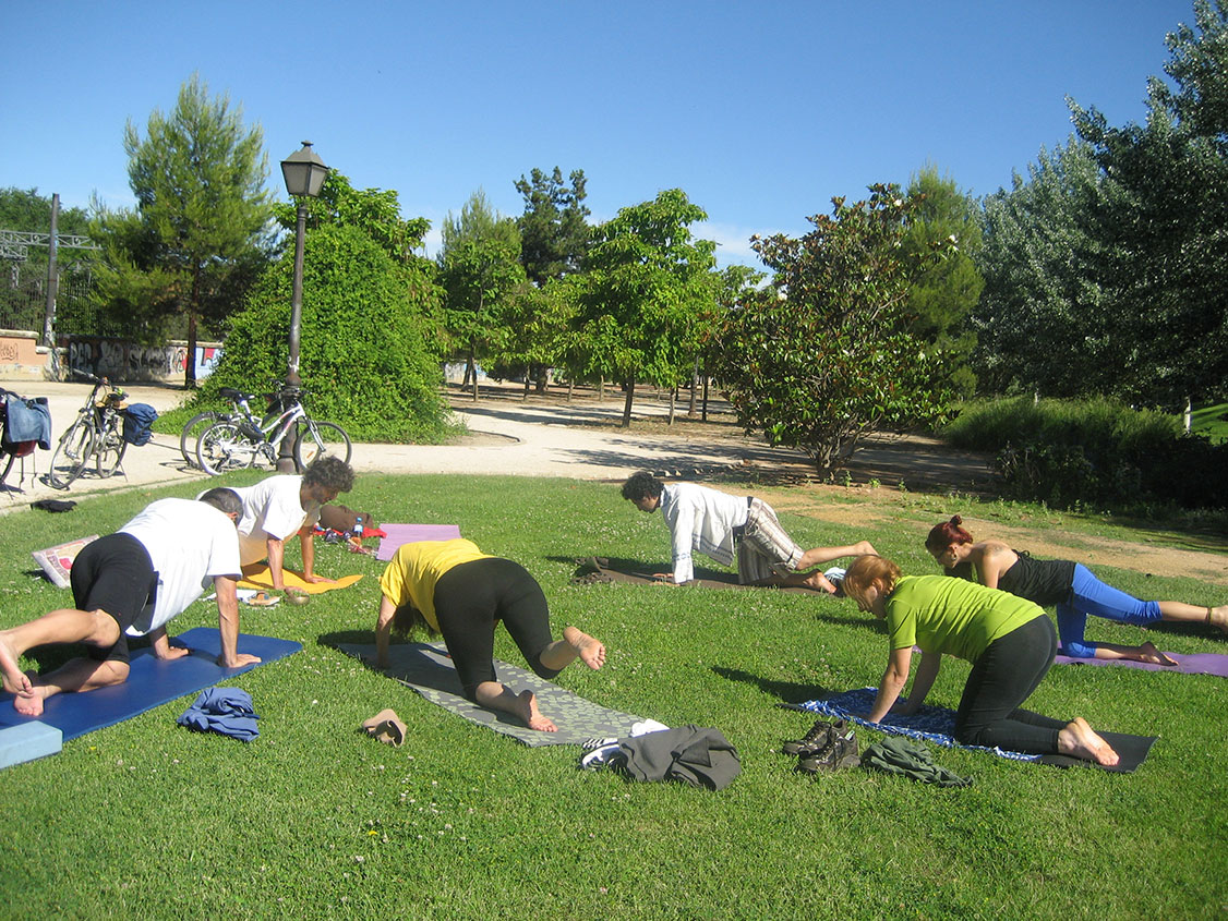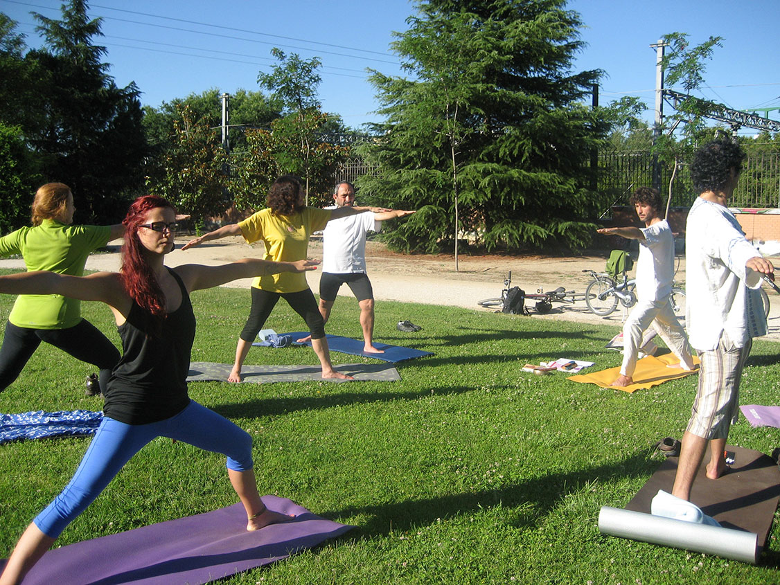 Ayer sábado, bien tempranito, saludamos yóguicamente al recién salido sol desde el parque del Oeste. Partiendo del Templo de Debod fuimos en busca de un espacio para realizar los ejercicios de yoga. Y ya lo creo que lo encontramos, un espacio vestido de césped verde brillante, mullidito y acogedor.