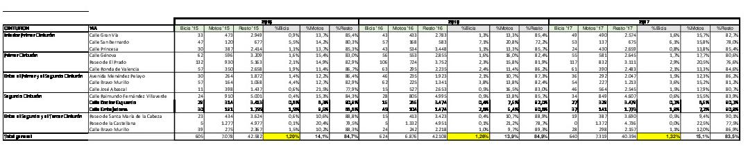 Y sorprende un descenso del uso de la bici en vías de la importancia de: San Bernardo (-1 %), Princesa (-0,3 %), Ronda de Valencia (-0,3 %), Menéndez Pelayo (-0,6 %), Bravo Murillo (-0,2 %), Embajadores (-0,9 %) o el Paseo de la Castellana (-1 %), quedando esta última en un 0,0 %.