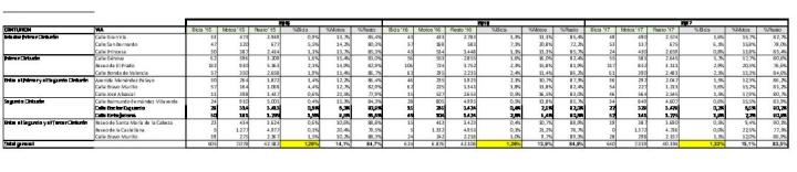 … al tiempo que una subida en Gran Vía (0,3 %), Génova (0,1 %), Paseo del Prado (0,6 %), José Abascal (1 %), Raimundo Fdez. Villaverde (1 %), Doctor Esquerdo (0,3 %), Santa María de la Cabeza (1 %) y Bravo Murillo (0,1 %).