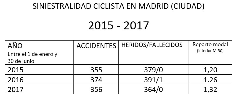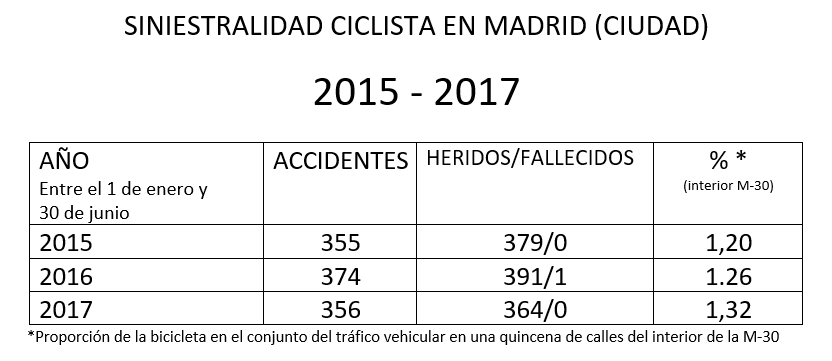 De acuerdo a los datos aportados por el Ayuntamiento de Madrid, se desprende una progresión favorable en la tasa de accidentabilidad ciclista entre los años 2015-2017, en un contexto de ligero aumento de los desplazamientos en bicicleta. Por no disponer aun de los datos completos del 2017 se toma como referencia el período de 1 de enero al 30 de junio. En la tabla del 2017, por tanto, no aparece reflejado el trágico accidente mortal de julio.
