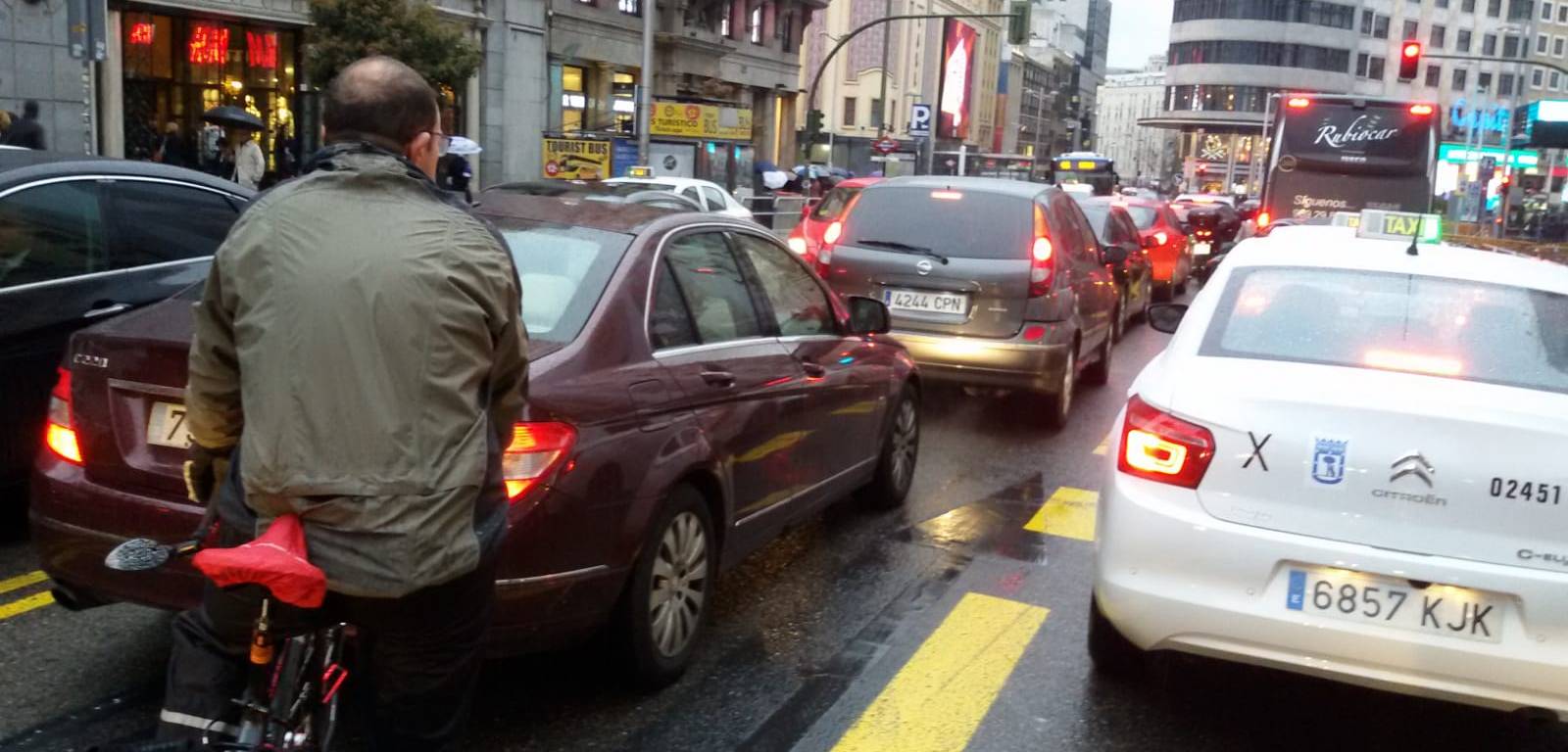 La bicicleta se somete al coche, tanto en los tramos compartidos (casi todos) como en el exclusivo de subida desde Plaza de España hasta Callao ya que por su situación, entre el carril bus-taxi-moto y uno convencional, queda condicionada por la contaminación y expuesta a ser sobrepasada por ambos lados por motorizados, a una diferencia de velocidad mayor que si el tramo fuera llano o de bajada.