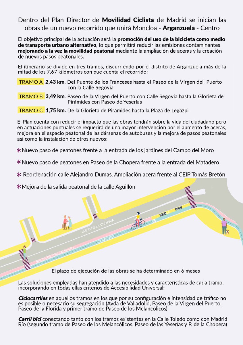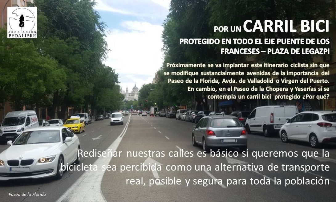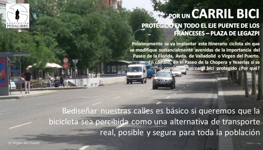 El futuro itinerario ciclista que el concejal José Manuel Calvo anuncia, del Puente de los Franceses a Legazpi, no reúne la necesaria accesibilidad ciclista, ya que dos terceras partes transcurren por avenidas principales, sin que se aplique ninguna medida efectiva que genere condiciones favorables de seguridad y atractivo para la movilidad en bicicleta.