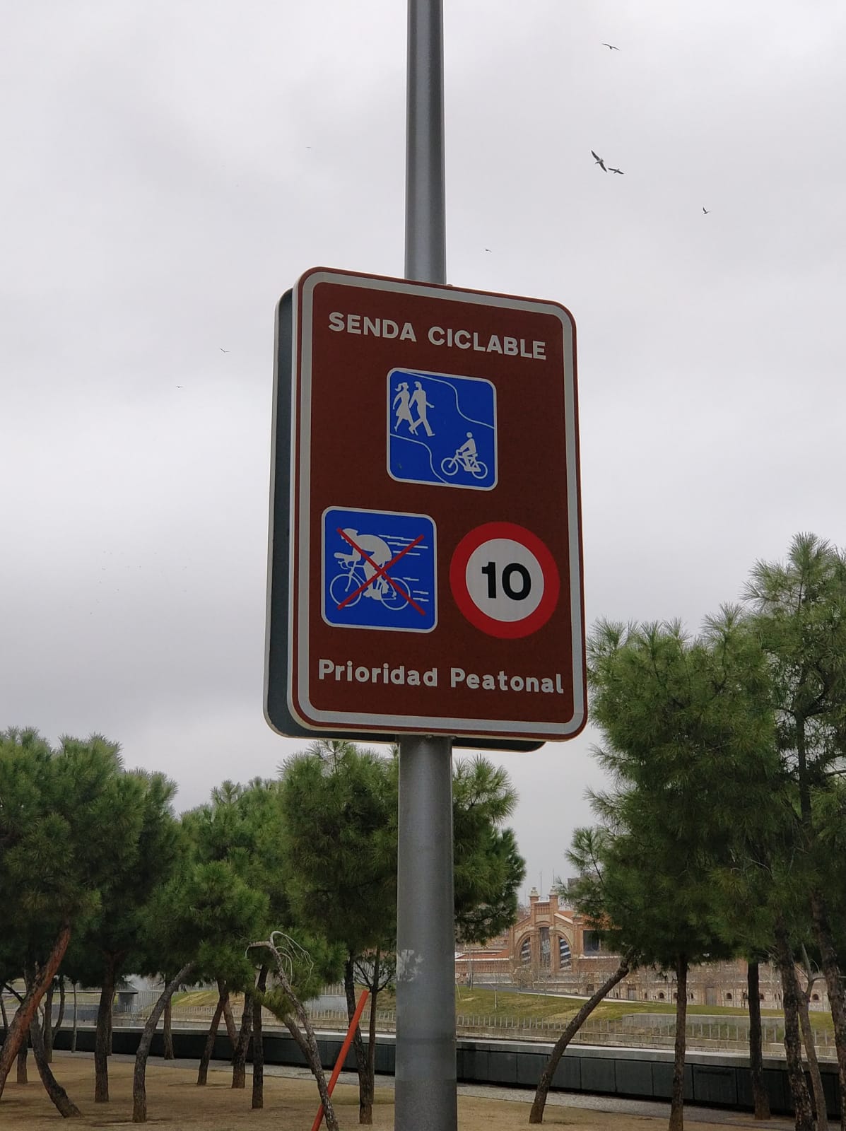 Las vías pavimentadas de Madrid Río actualmente están consideradas como sendas ciclables. Como tales, los peatones tienen siempre prioridad y las bicicletas deben circular a velocidad moderada (10 Km/h máximo), cediéndoles el paso si es necesario.