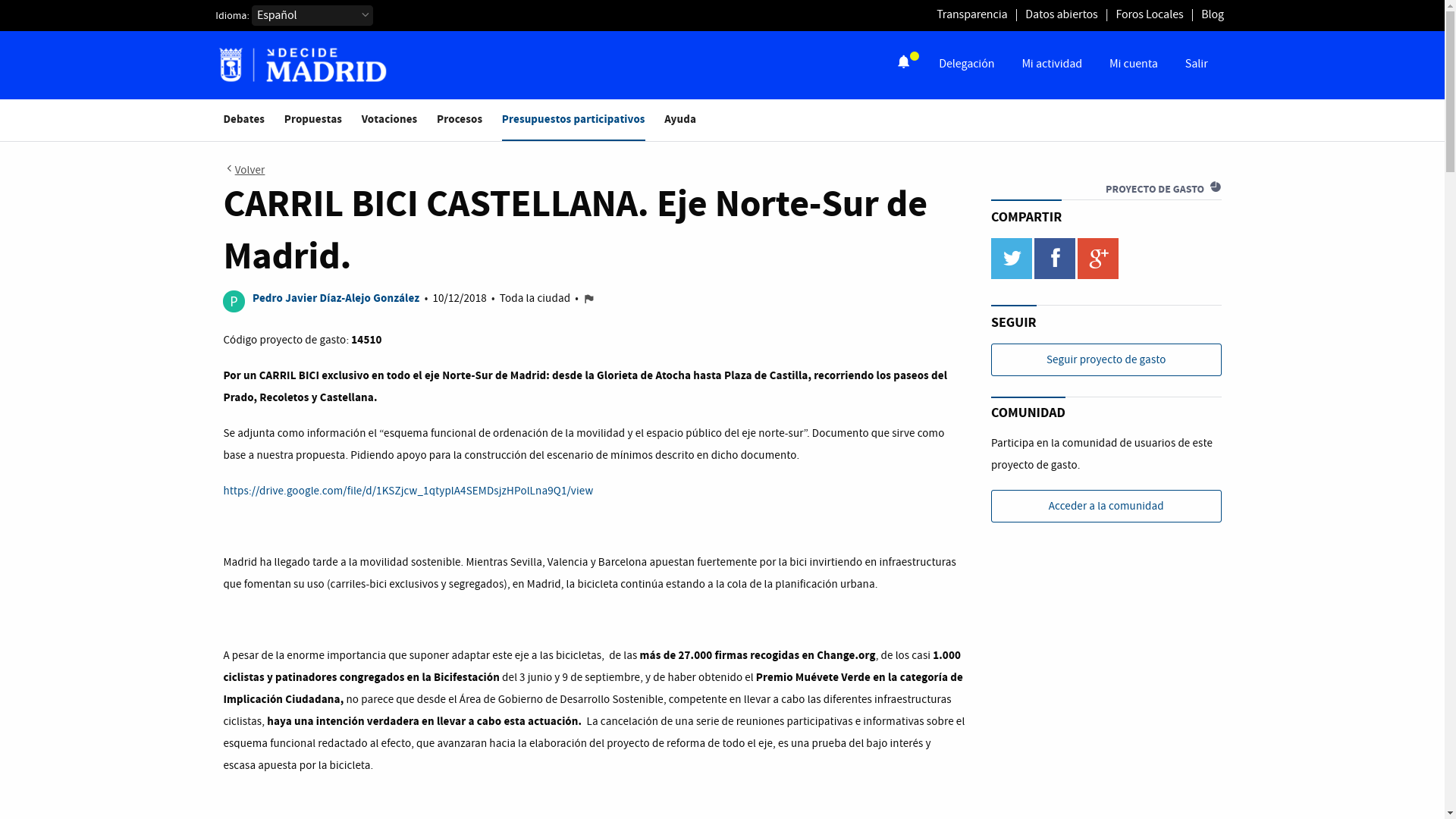 - Pedalibre y Carril bici Castellana (representados por Pedro Dรญaz Alejo) han presentado en los Presupuestos Participativos de 2019 un proyecto para la creaciรณn de un carril bici en el eje Prado-Recoletos-Castellana. En nuestra asamblea del martes tambiรฉn decidimos presentar proyectos de vรญas ciclistas en varios distritos.