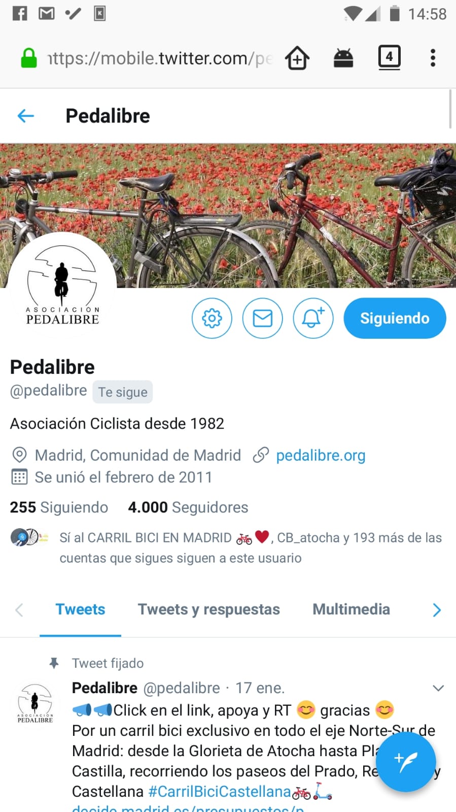 Este sรกbado alcanzamos los 4.000 seguidores en nuestra cuenta de Twitter @Pedalibre.