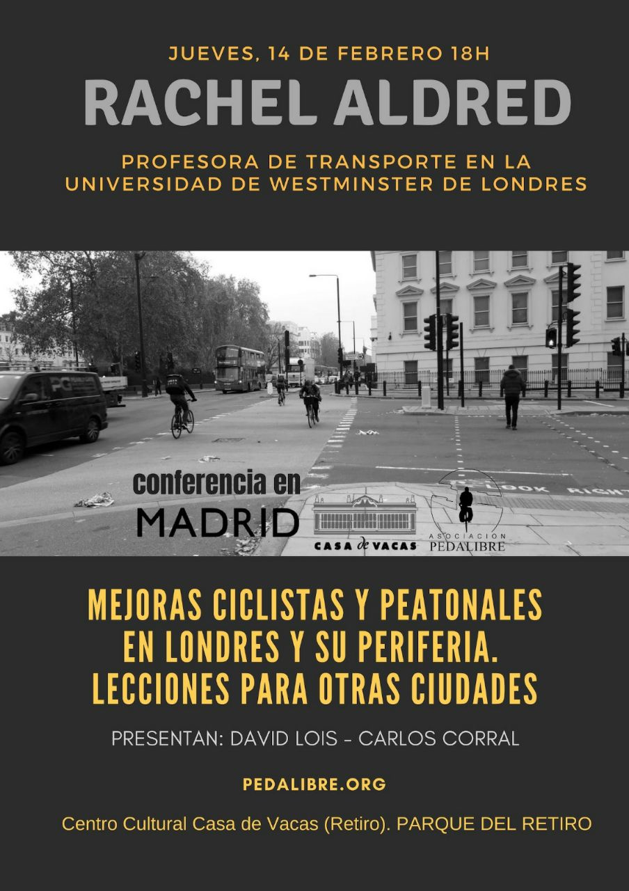 El jueves, 14 de febrero, a las 18 h, en el Centro Cultural Casa de Vacas (El Retiro), tendremos la gran oportunidad de conocer las investigaciones de la Dra. Rachel Aldred en materia ciclista y peatonal en la ciudad de Londres y su periferia.