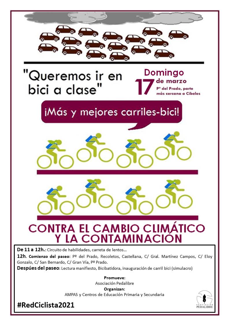 Por segundo año consecutivo, los centros educativos se movilizan a favor de la construcción de carriles bici protegidos en Madrid a fin de promover el uso diario de la bicicleta. En esta ocasión, unen su reivindicación a la de acciones reales y efectivas contra el cambio climático, expresadas por el movimiento Juventud por el Clima y a la propuesta que presentó la Asociación Pedalibre de Red Ciclista 2021.