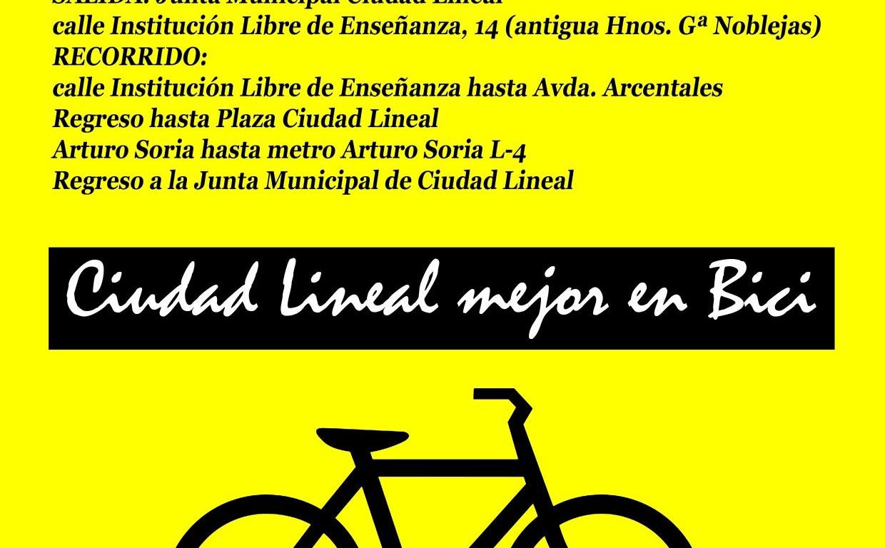 La convocatoria será el domingo 19 a las 11 h, en la Junta Municipal del Distrito de Ciudad Lineal (calle Institución Libre de Enseñanza, 16) y consistirá en un paseo relajado en bicicleta o en cualquier otro medio compatible (patines, monopatín …) por esta misma calle y Arturo Soria.