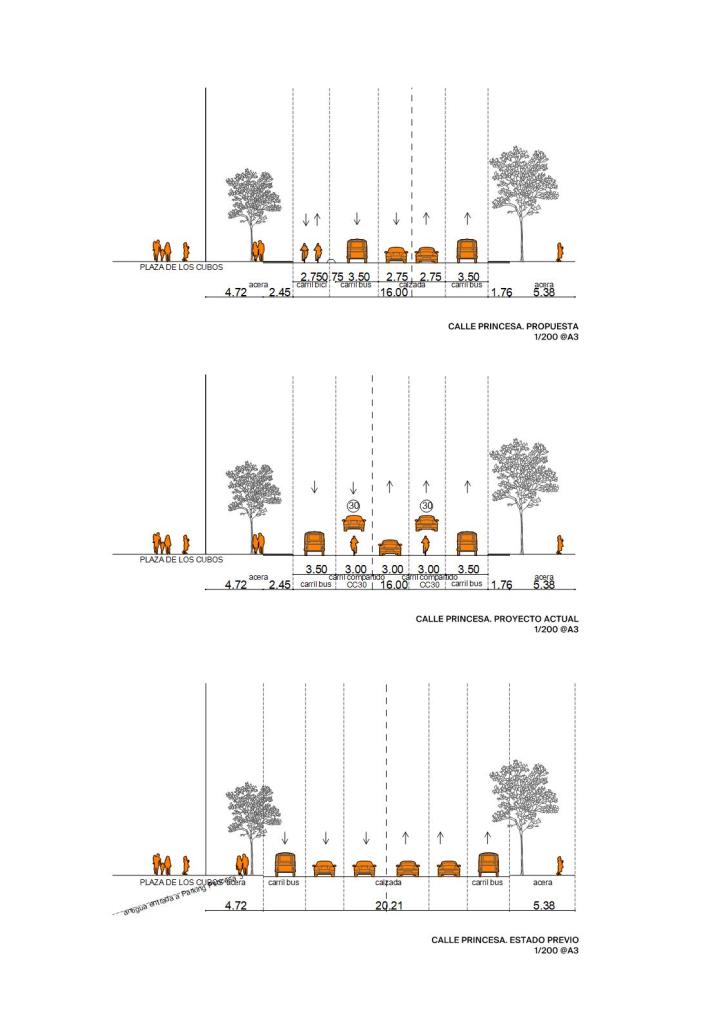 Para una mejor comprensión de la propuesta de mejora en la reforma de la Plaza de España y su entorno que presentamos el 31 de agosto, damos a conocer las secciones de las calles Princesa y Cuesta de San Vicente como ejemplos de ello.