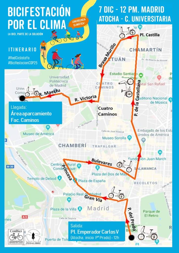 Como en su momento apuntamos, la ciudad de Madrid no puede cambiar la lucha por el cambio climático por la lucha contra la bicicleta y el medio ambiente, como así se desprende de sus primeras actuaciones, sino todo lo contrario. Como anfitriona de la Cumbre por el Clima tendría que dar ejemplo y abanderar una política valiente a favor de la movilidad sostenible, invirtiendo en crear vías ciclistas segregadas, protegidas e interconectadas que estructuren todo el territorio de manera que cualquier persona, indistintamente del lugar donde viva, trabaje, estudie, etc. y de sus capacidades, tenga en la bicicleta un fiel aliado para poderse desplazar de manera cómoda, segura y eficaz.