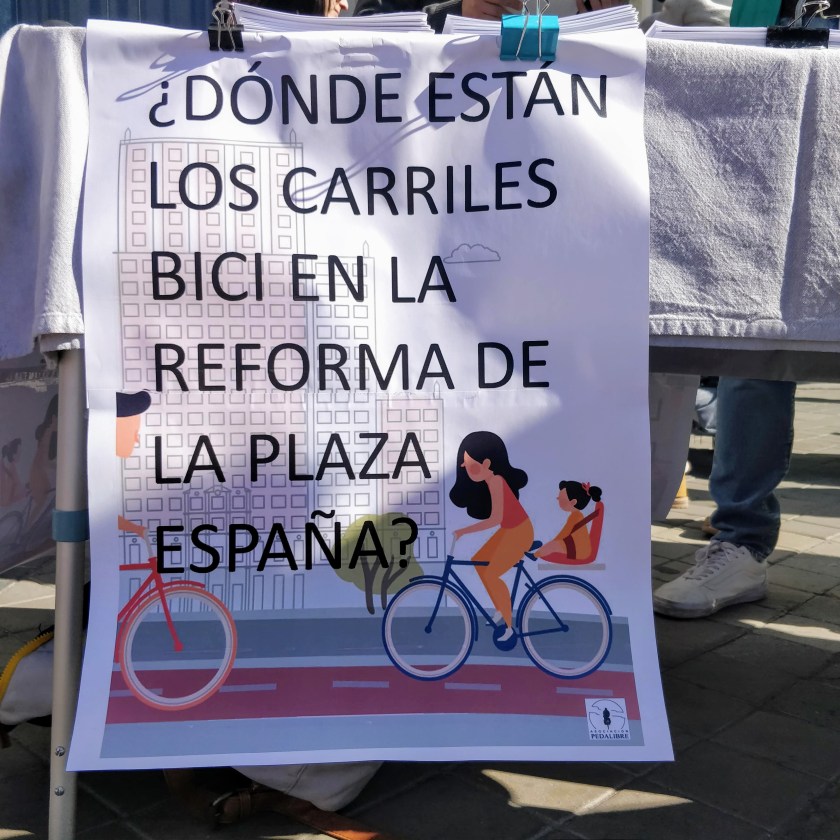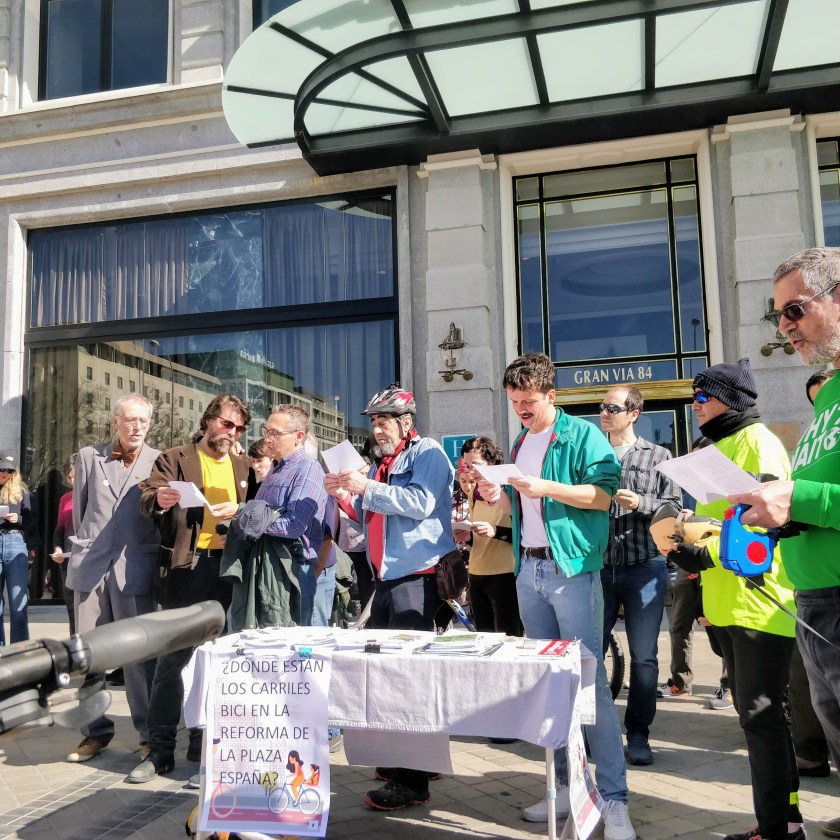 El carril bici segregado y protegido de Pza. España formaba parte de la memoria del proyecto ganador de reforma en el proceso participativo previo y ya estaba contemplado en el gran eje ciclista descrito en el Plan Director de Movilidad Ciclista de Madrid (PDMCM), aprobado desde 2008 por unanimidad de todos los grupos políticos. Discurre desde la Ciudad Universitaria hasta el este de nuestra ciudad, recorriendo las calles de Princesa, Gran Vía, Alcalá y Avda. de Logroño y cruzando los distritos de Moncloa-Aravaca, Centro, Salamanca, Ciudad Lineal, San Blas-Canillejas y Barajas hasta el límite municipal de Paracuellos del Jarama. Pero la actual reforma de la plaza, sorprendentemente, no recoge la construcción de carriles bici en la misma ni en los ejes principales aledaños (Cuesta de San Vicente, Princesa, Ferraz…).