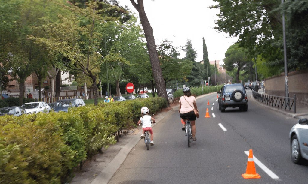 2. Creación de corredores ciclistas. La eficiencia de la bicicleta pasa necesariamente por crear trayectos exentos de rodeos y con el menor desnivel posible. En este sentido, son las grandes avenidas las más eficientes pero que, aun estando hoy por hoy vacías, son un elemento de riesgo por las mayores velocidades de los motorizados y la velocidad comercial del transporte público. Habilitar los carriles bus para uso ciclista exclusivo, aprovechando la bajísima ocupación actual y/o crear carriles bici temporales a partir de elementos sencillos y fácilmente retornables como pintura, jardineras, conos, etc. puede ayudar a que los traslados en bicicleta se hagan con la seguridad necesaria.