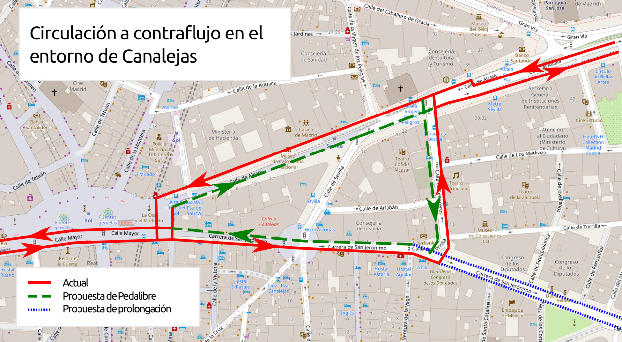 La reforma definitiva del entorno de Sol debe incluir el doble sentido ciclista —carril bici a contramano— en Alcalá (Sol-Cedaceros) y Carrera de San Jerónimo (Cedaceros-Sol).