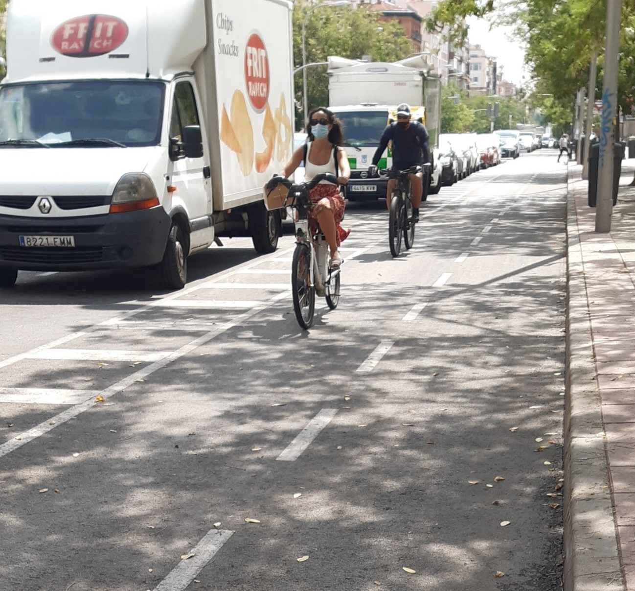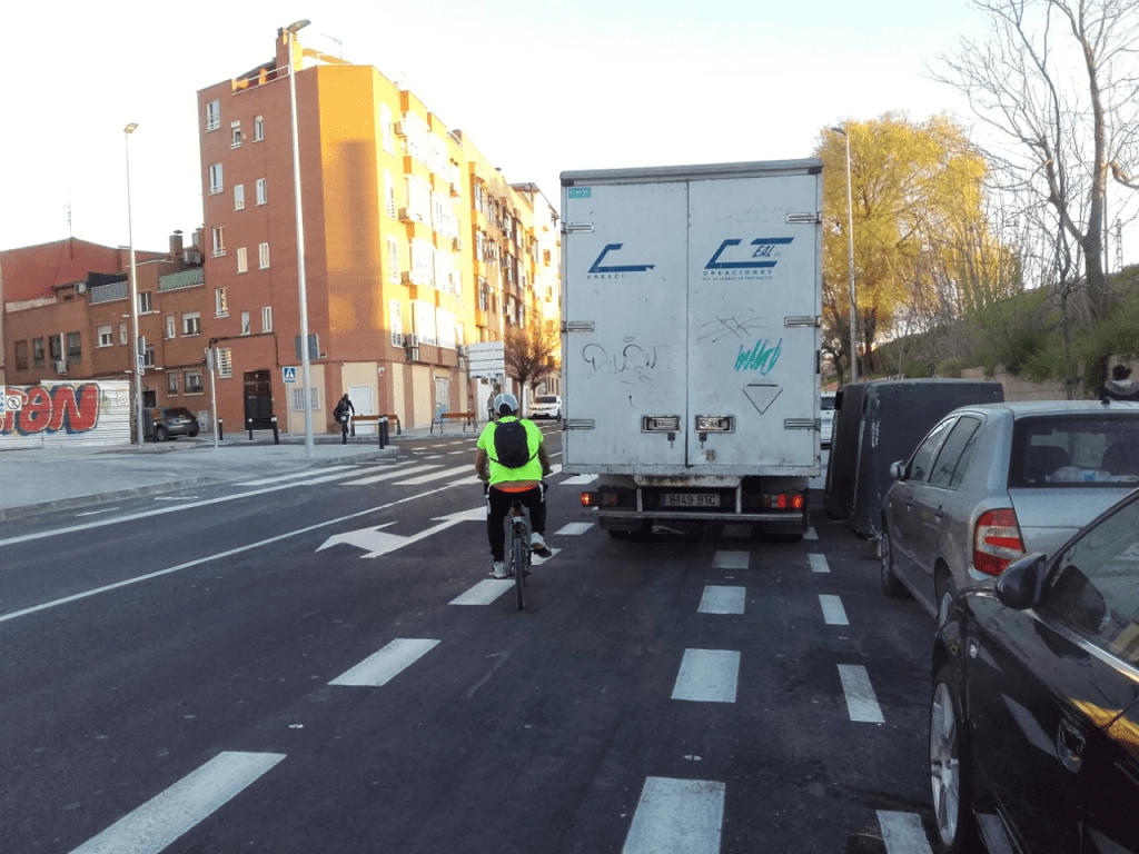 - Por otra parte, este tipo de diseño de carril bici, pintado sobre la calzada, sin elementos protectores, y situado entre plazas de aparcamiento y carriles convencionales, hacen que sea una alternativa muy recurrente para la carga y descarga o los aparcamientos en doble fila.