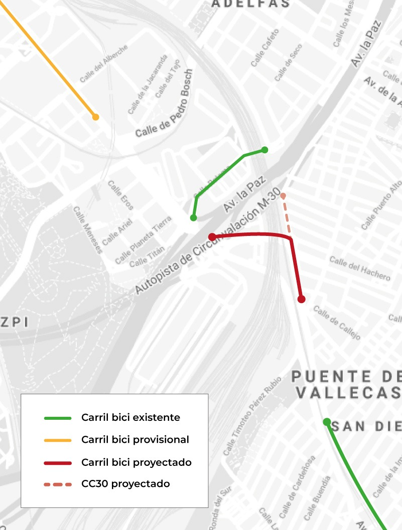 - El Carril Bici proyectado no conecta con el deficiente carril bici de la calle Puerto de Balbarán, que llega hasta la estación de Cercanías del Pozo, ni con el de la calle Retama, ni se prolonga por Méndez Álvaro hasta Atocha. Se insiste en el ciclocarril, hasta Pico Cebollera, lo que altera el grado de accesibilidad y seguridad. En la siguiente imagen se puede observar de forma esquemática la ubicación del nuevo carril bici, representado en rojo, y su relación con otros carriles bici cercanos.