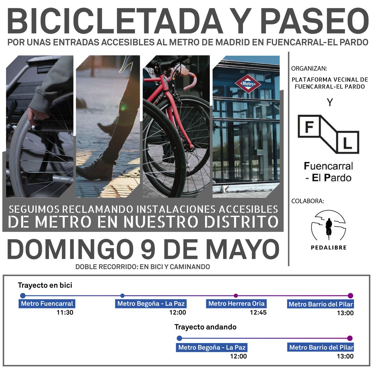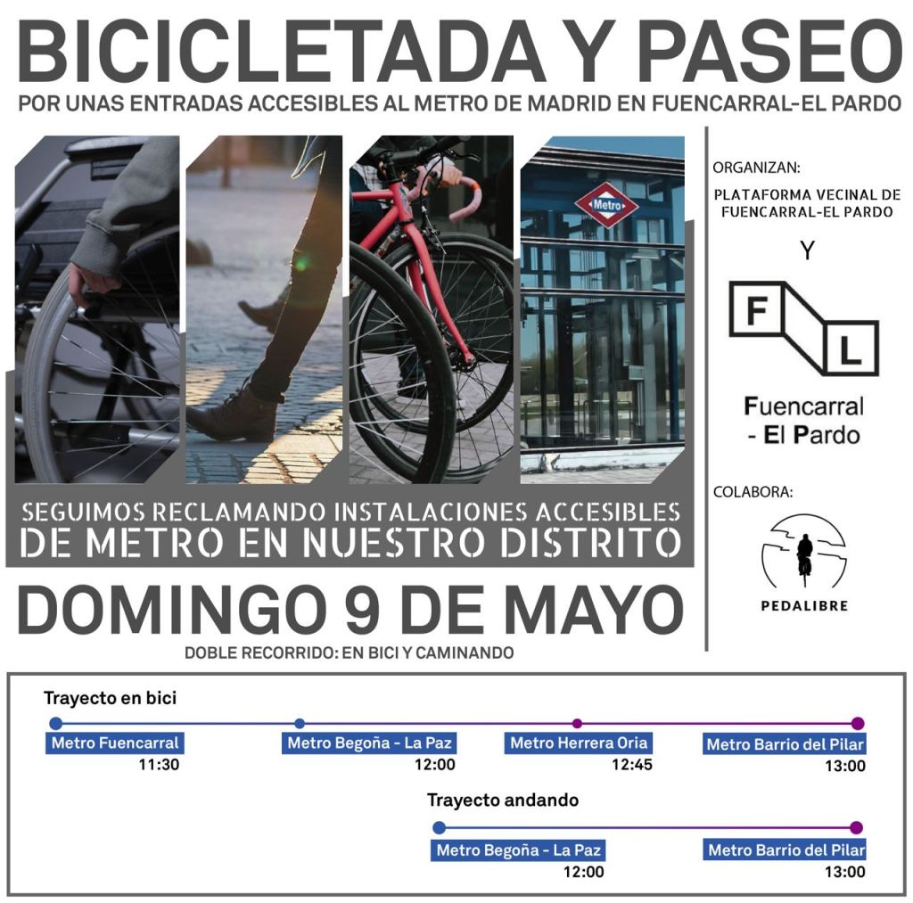 El próximo domingo, 9 de mayo, tenemos una cita para apoyar a la Plataforma Vecinal de Fuencarral-El Pardo y el Foro Local de este distrito, en reivindicar la accesibilidad al Metro y un mayor atractivo del transporte público para toda la población. Lo haremos con un recorrido en bicicleta, como modo activo de movilidad, por algunas de las calles que las propias asociaciones vecinales reclaman la construcción de carriles bici y que forman parte de la Red Básica Ciclista.