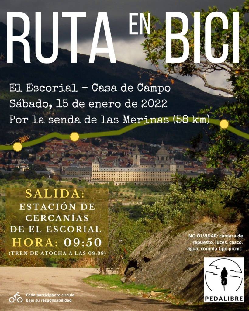 El Sรกbado 15 de enero, Pedalibre propone una ruta en bicicleta entre la estaciรณn de Cercanรญas de El Escorial y el Lago de la Casa de Campo de Madrid.