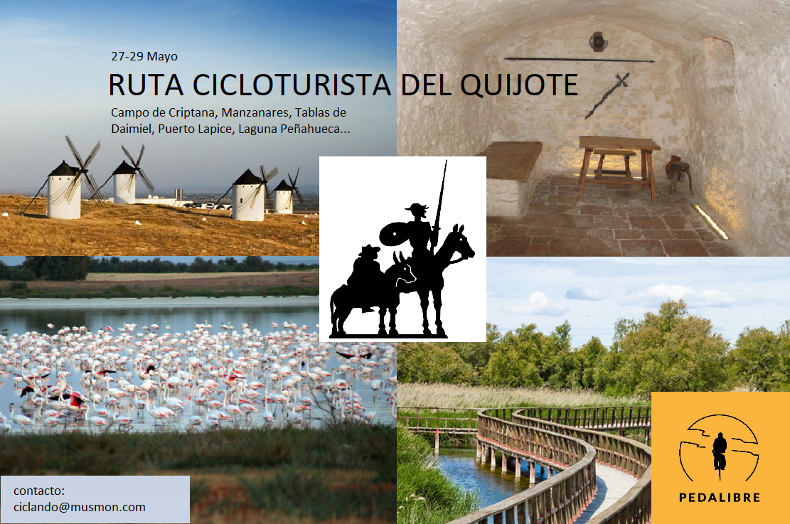 La ruta nos permitirá disfrutar de las llanuras manchegas en bicicleta, plantar cara a los gigantes o molinos de Campo de Criptana, descender a la cueva donde estuvo preso Cervantes, ciclar sobre las aguas del parque de las Tablas de Daimiel, visitar la laguna de Peñahueca y, quizás, ver algunas aves y muchas más cosas, como degustar algunos quesos manchegos …