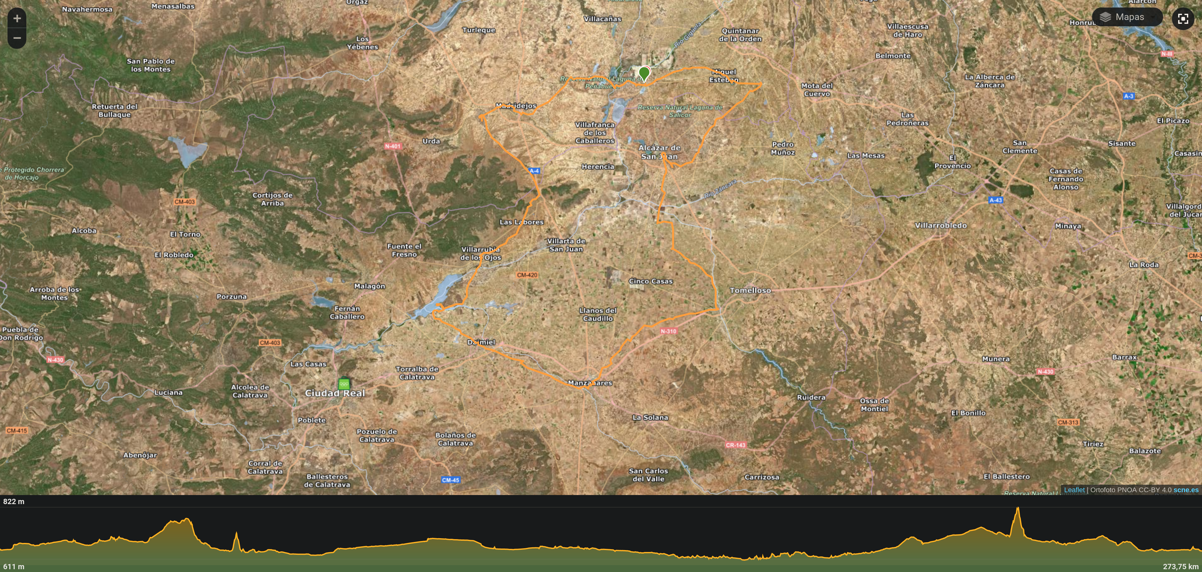 La ruta circular completa es, según el libro, de 273 Km, con un pequeño desnivel hasta los 801 m y por pistas llanas en buen estado.