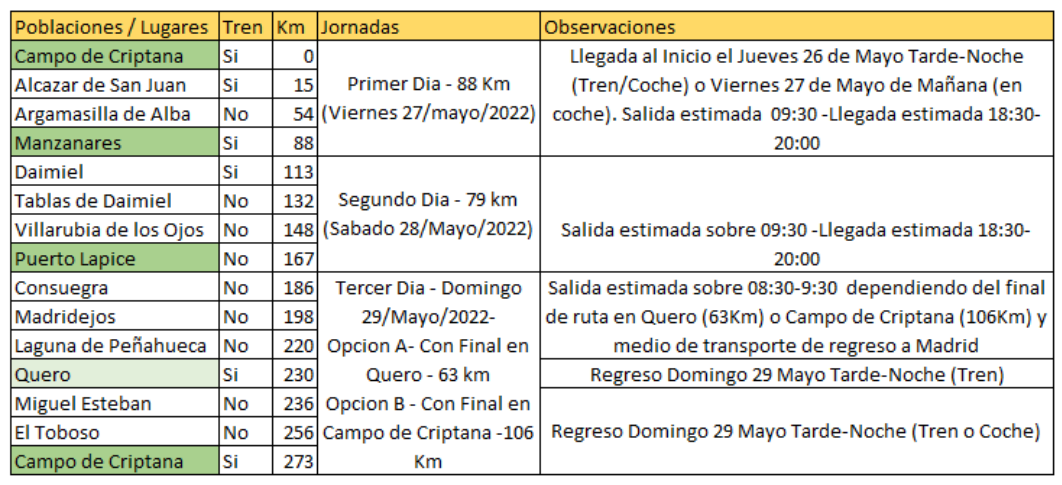 Los lugares de pernocta podrÃan ser Campo de Criptana, Manzanares, Puerto Lápice y de nuevo Campo de Criptana o Quero para facilitar la ruta, bien sea de 3 o 2 dÃas. El regreso puede ser en tren o en coche.
