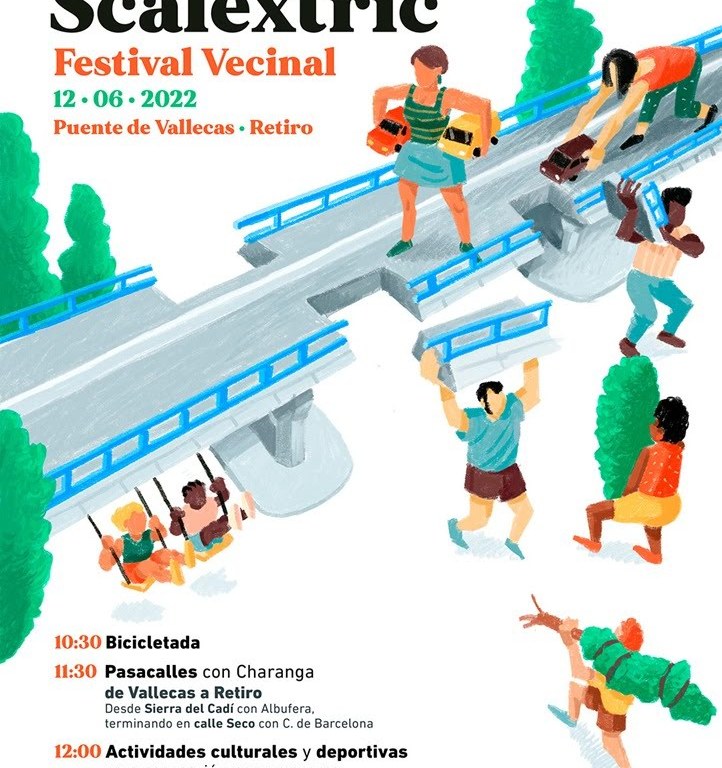 Así pues, el próximo domingo, 12 de junio, celebraremos el Festival Vecinal Fuera el Scalextric, y una bicicletada a las 10:30 con punto de encuentro en la esquina de la calle Sierra del Cadí con la Avda. Albufera.
