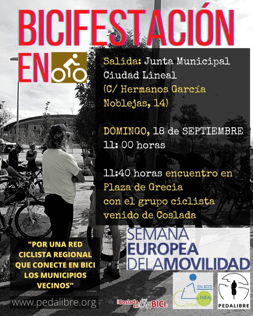 Esta bicicletada, organizada también por la Plataforma Bicilineal, cuenta con la participación de Coslada en Bici. Consistirá en una marcha en bici desde la Junta Municipal de Ciudad Lineal a las 11 h hasta la Pl. de Grecia (Las Rosas) y vuelta. En la Pl. de Grecia, sobre las 11:40, nos uniremos con el grupo de ciclistas que subirán desde Coslada por la M-201 y reivindicaremos una red ciclista regional y la conexión ciclista entre los municipios.