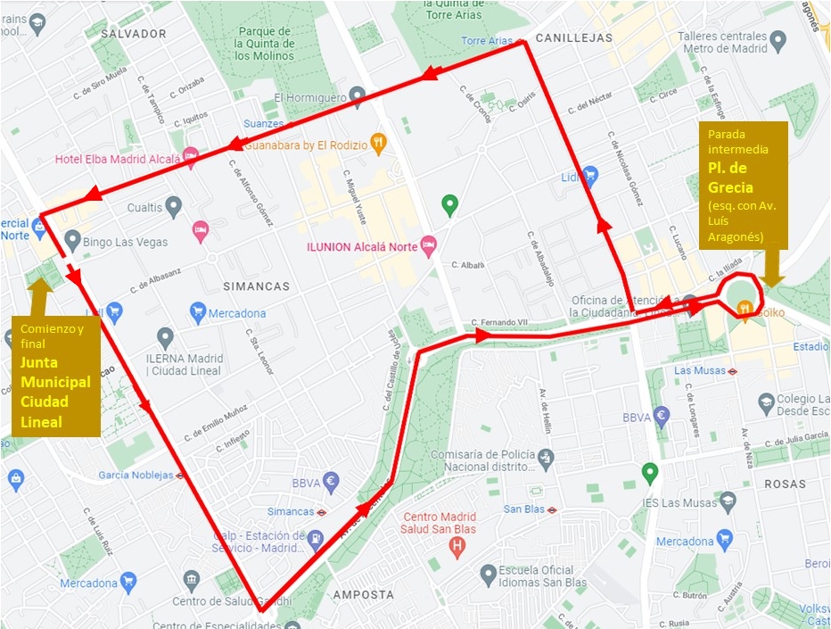 El recorrido, por tanto, será: Hnos. García Noblejas, Av. Arcentales, Pl. de Grecia, Av. Arcentales, Av. Canillejas a Vicálvaro, Alcalá y Hnos. García Noblejas.