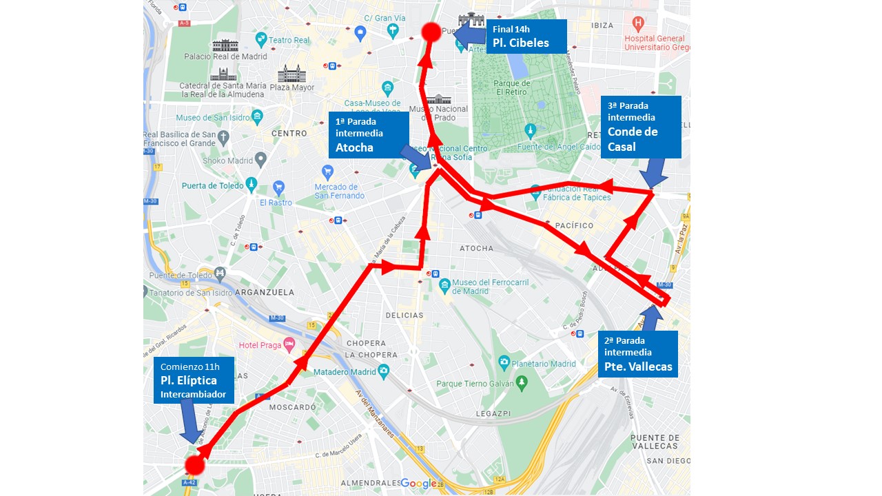 El recorrido será: Pl. Elíptica, Santa María de la Cabeza, Ferrocarril, Delicias, Gta. Emperador Carlos V (parada en estación Atocha), Ciudad de Barcelona, Puente de Vallecas (parada), Ciudad de Barcelona, Dr. Esquerdo, Conde de Casal (parada), Av. de Mediterráneo, Paseo de Reina Cristina, Paseo de Infanta Mercedes, Gl. Emperador Carlos V, Paseo del Prado y Cibeles. Este itinerario incluirá paradas en Atocha, Puente de Vallecas y Conde de Casal.