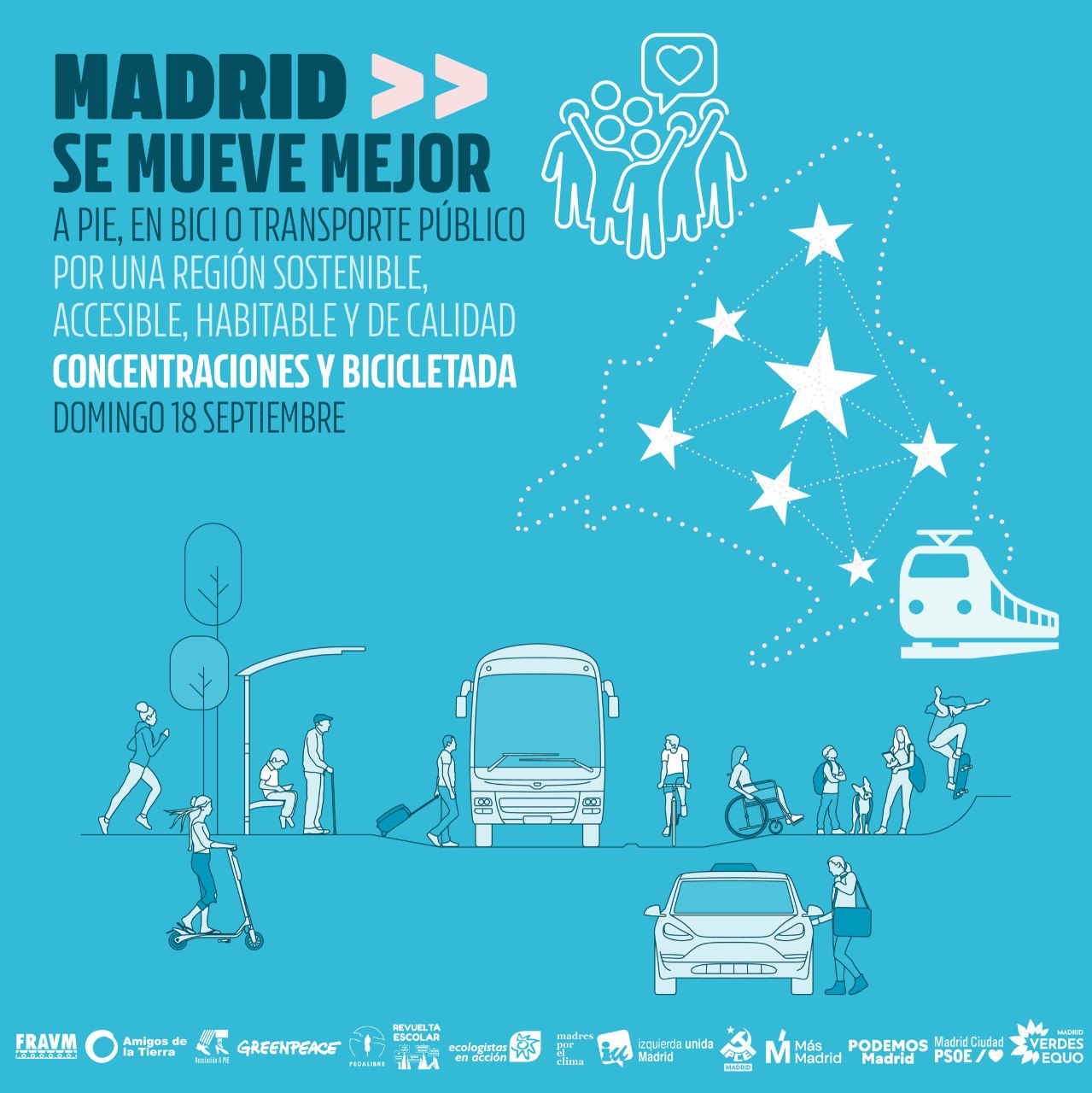 Esta movilización ciudadana está convocada por diferentes asociaciones como: FRAVM, Amigos de la Tierra, Ecologistas en Acción, Greenpeace, Pedalibre, A Pie, Revuelta escolar y Madres por el Clima, Taxi Project y Elite Taxi; junto a los partidos políticos: Izquierda Unida Madrid, Más Madrid, Podemos Madrid, PSOE, PCM y Verdes EQUO Madrid.