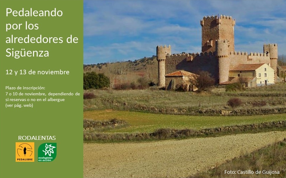Descripción: El sábado elegiremos la ruta en función de la lluvia: Si llovió, iremos al oeste de Sigüenza a conocer las fuentes del río Dulce en Estriégana, pasando por el castillo de Guijosa y el castro. Si no, podemos optar por ir al norte a conocer el río Salado, visitando las salinas de Imón, Palazuelos y Santamera. Lo decidiremos el sábado entre todas. El domingo iremos al este, bajando por el otoñado río Dulce hasta Aragosa y regresando a Sigüenza por el río Henares. Llegada a Sigüenza sobre las 19h. Puedes pasar todo el fin de semana en Sigüenza o venir solo un día, como prefieras.