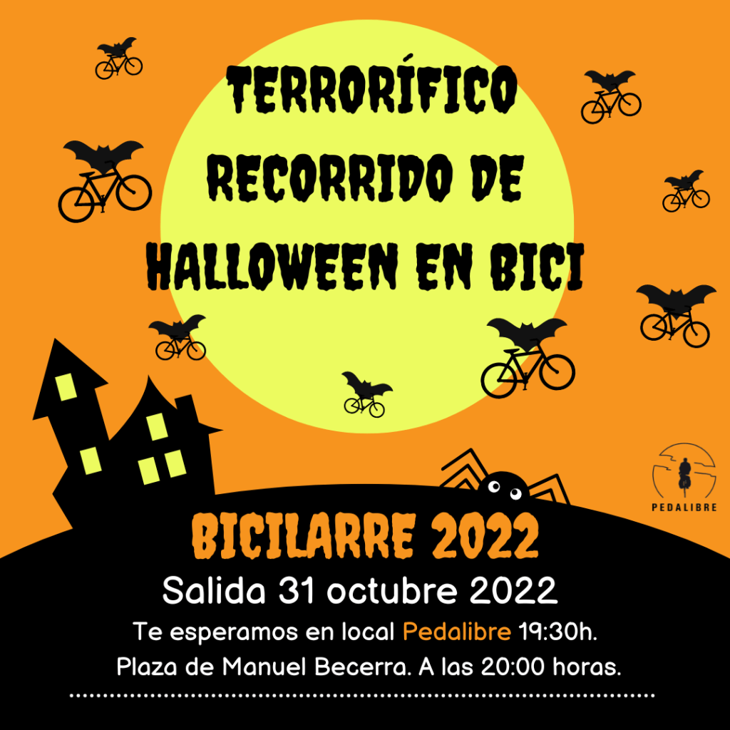 Nos vemos el lunes 31 de octubre, a las 19:30 horas, en el local de Pedalibre donde podrás disfrazarte o vestirte con los colores de la vida o de la muerte, de naranja o de negro. A las 20 horas, haremos una parada con nuestras bicis en la plaza de Manuel Becerra para recoger a las personas que no lleguen a tiempo a nuestro local.