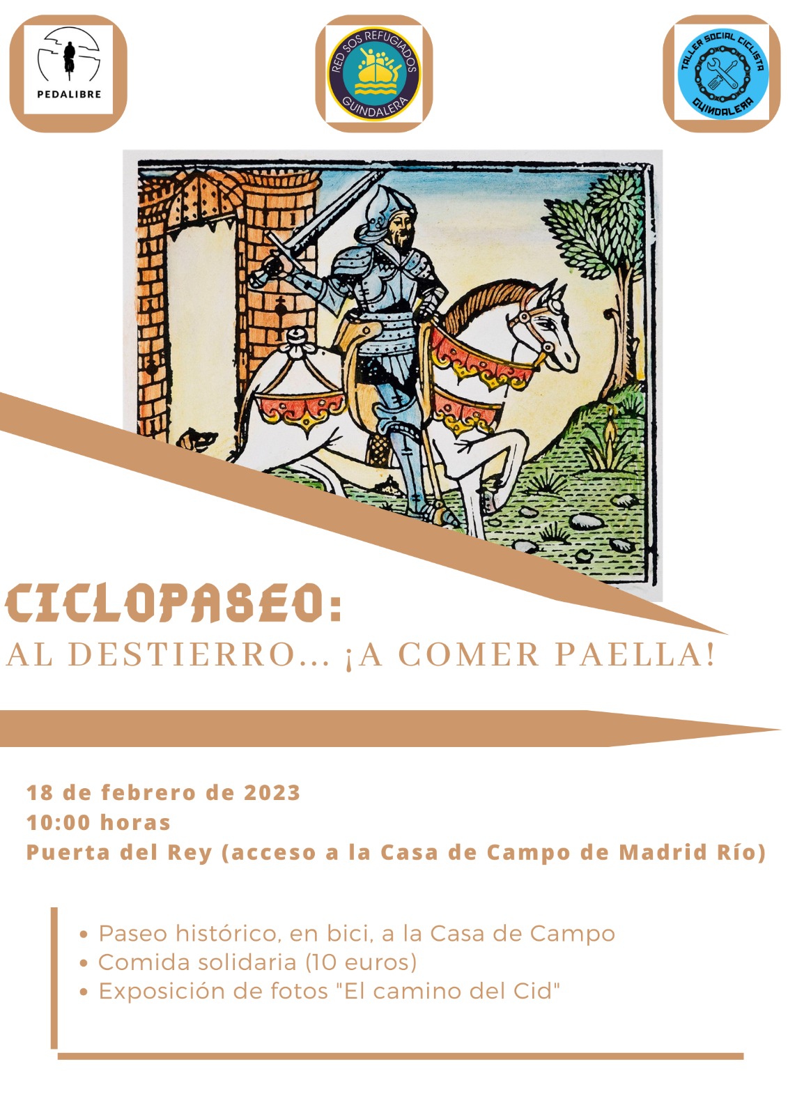 Saldremos a las 10 h de la Puerta del Rey, después nos dirigiremos al local de Pedalibre para degustar una paella solidaria, y tras el postre y café, habrá un pase de fotos del Camino del Cid por Walter Post.