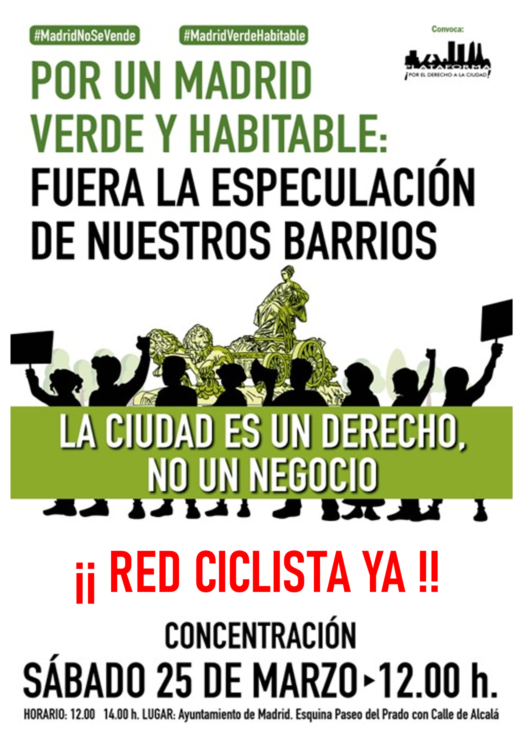 En marzo, la Plataforma por el Derecho a la Ciudad, vuelve a invitar a la ciudadanÃa y a los colectivos ciudadanos a salir a la calle para visibilizar las diferentes problemáticas de los barrios. Con el lema La ciudad es un derecho, no un negocio, el sábado 25 de marzo nos concentraremos en Cibeles, delante del Palacio de Comunicaciones, sede del Ayuntamiento de Madrid. Desde allà marcharemos alrededor de la fuente de Cibeles para volver al punto de inicio donde intervendrán los diferentes colectivos participantes para explicar las numerosas problemáticas que afectan a sus barrios.
