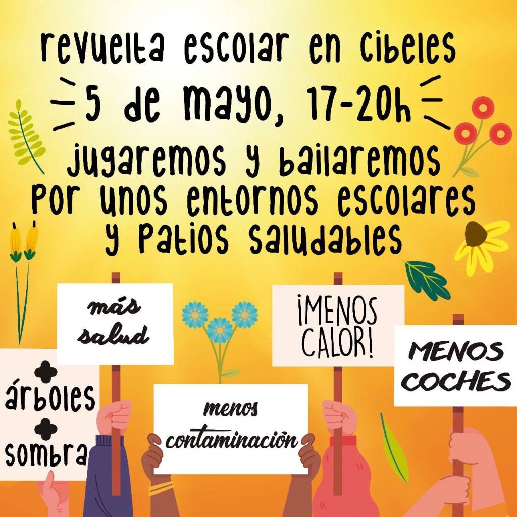 El viernes 5 de mayo de 17 a 20 h tendremos nuestra cita anual para reivindicar entornos escolares seguros de la mano del movimiento de Revuelta Escolar. La convocatoria es alrededor de Cibeles. Diversas asociaciones organizarรกn actividades para los mรกs pequeรฑos y hasta habrรก un concierto de la mano de Postdata.