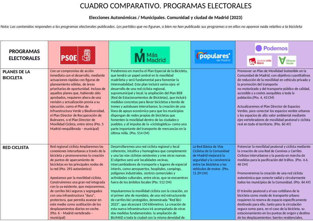 Lamentamos la dificultad y la imposibilidad de acceder a algunos de los programas electorales y nos entristece profundamente el escaso o nulo interés de la bicicleta en algunas fuerzas políticas. Se da la circunstancia, incluso, que en algún caso es mayor la apuesta que realizaron en 2021 de la que hacen ahora. Tal es el caso del PP para la Comunidad de Madrid. Peor escenario es el que protagoniza Ciudadanos o Vox donde aparentemente, no hacen ninguna referencia a la bici. También, sorprende, salvo algún artículo en prensa, la no publicación del programa electoral para el ayuntamiento de Madrid de los partidos que actualmente ostentan la alcaldía: PP y Ciudadanos. Tal vez, para saber sus propuestas sobre la bici, sea buena idea ver el Plan de Movilidad Sostenible 360 que en su momento publicaron y al que hicimos una serie de alegaciones que no respondieron.
