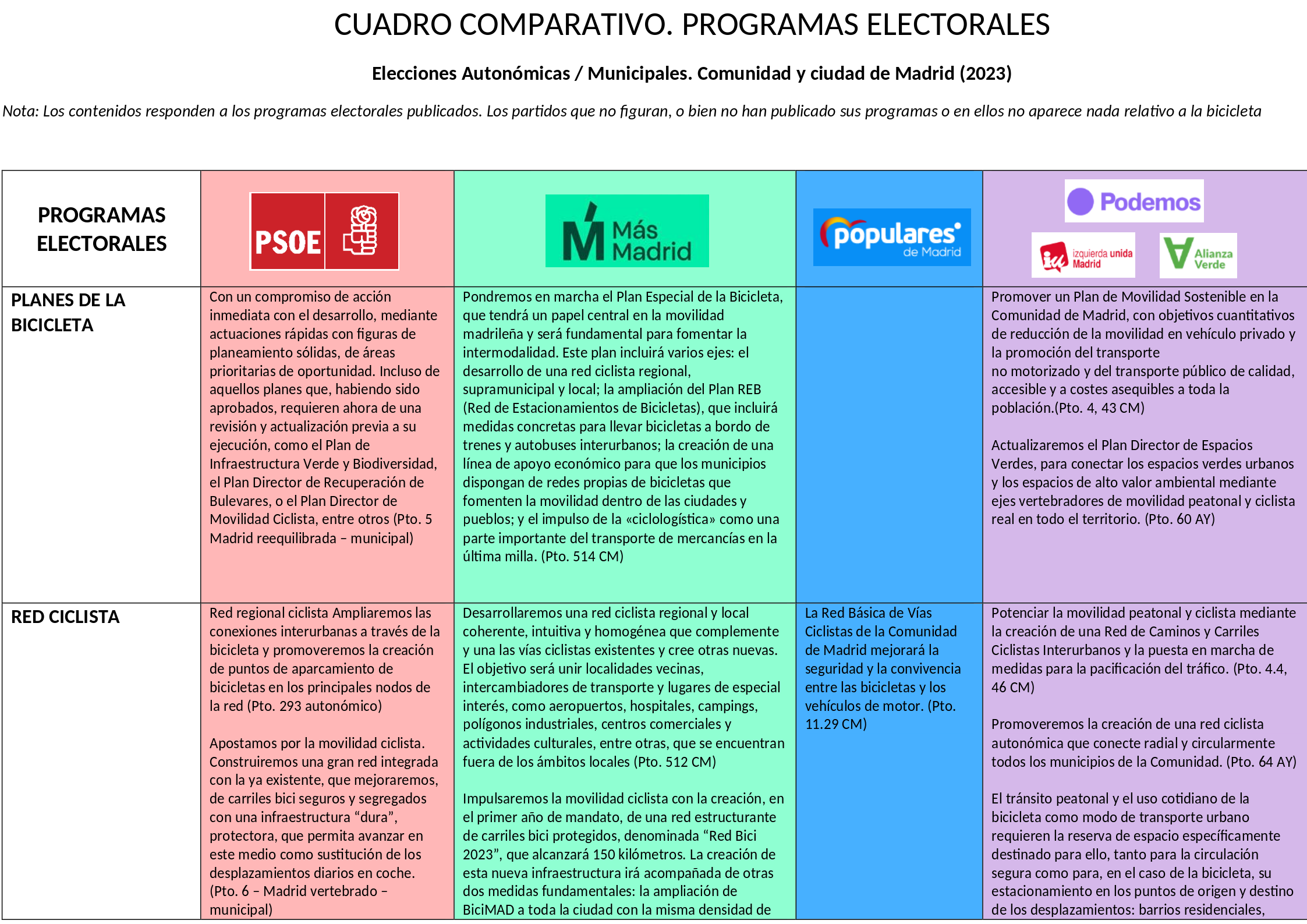 Lamentamos la dificultad y la imposibilidad de acceder a algunos de los programas electorales y nos entristece profundamente el escaso o nulo interés de la bicicleta en algunas fuerzas políticas. Se da la circunstancia, incluso, que en algún caso es mayor la apuesta que realizaron en 2021 de la que hacen ahora. Tal es el caso del PP para la Comunidad de Madrid. Peor escenario es el que protagoniza Ciudadanos o Vox donde aparentemente, no hacen ninguna referencia a la bici. También, sorprende, salvo algún artículo en prensa, la no publicación del programa electoral para el ayuntamiento de Madrid de los partidos que actualmente ostentan la alcaldía: PP y Ciudadanos. Tal vez, para saber sus propuestas sobre la bici, sea buena idea ver el Plan de Movilidad Sostenible 360 que en su momento publicaron y al que hicimos una serie de alegaciones que no respondieron.