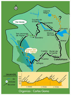 La ruta parte de la bella y medieval localidad de Calatañazor, hacia el cañón del rĂo Lobos que atravesaremos para llegar a la localidad de San Leonardo de YagĂŒe, donde cogeremos la vĂa verde que nos aproximarĂĄ a los bosques de conĂferas cercanos al nacimiento del rĂo Duero en Duruelo de la Sierra y desde allĂ volver a Calatañazor.
