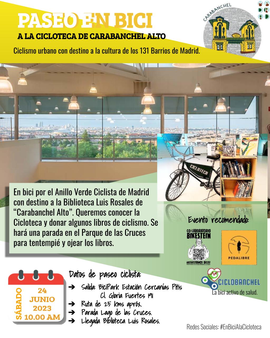 Partiendo del BiciPark de la Estación de CercanÃas de Pitis (Calle Gloria Fuertes 19), pedalearemos por el Anillo Verde Ciclista de Madrid hasta llegar a la CICLOTECA, ubicada en la Biblioteca Luis Rosales de Carabanchel Alto.