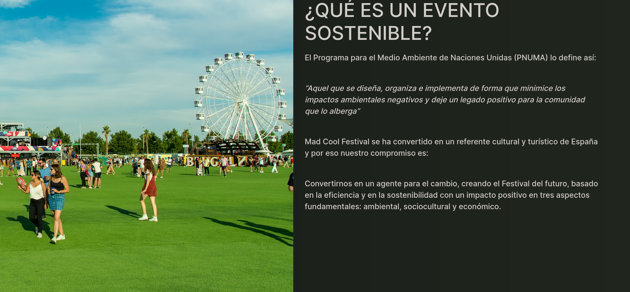 El futuro es verde. Sólo hay un planeta donde existe la música en directo, por eso, queremos que disfrutes de la versión más sostenible de Mad Cool Festival. Sabemos que todas las decisiones que tomamos a diario tienen un impacto real y directo en nuestro planeta. Por eso, tenemos la responsabilidad de crear un festival lo más sostenible posible, para que, con la ayuda de todos, podamos seguir disfrutando juntos de esta experiencia tan increíble.