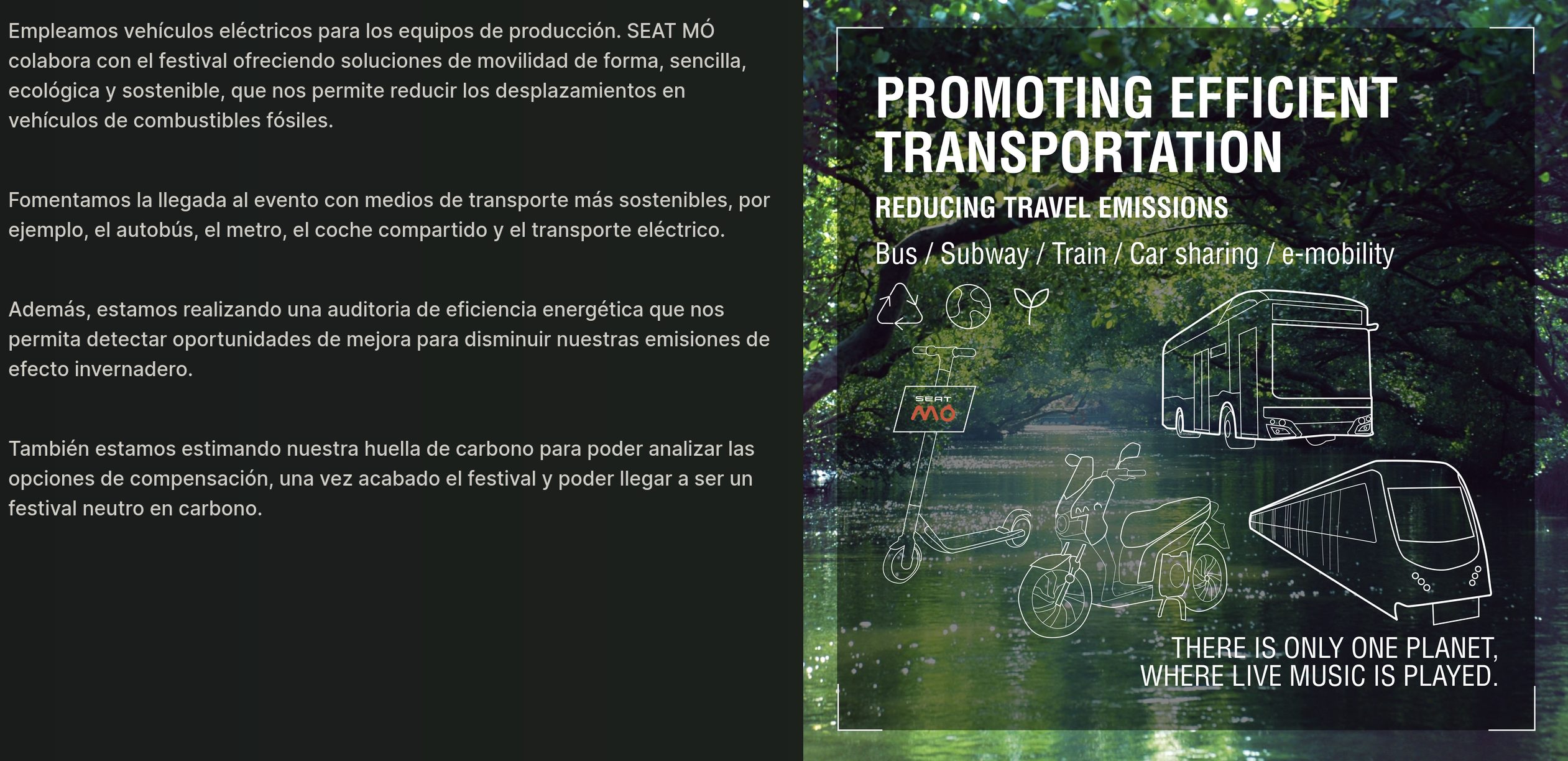 Entendemos que este compromiso no debe ceñirse exclusivamente al recinto del evento sino que debe ir más allá y contemplar la movilidad hasta él. La movilidad es un aspecto clave ya que de todos es sabido el impacto y el caos circulatorio y de ocupación del espacio público que tiene la utilización del automóvil y más, cuando se trata de un gran festival como éste, que atrae un número muy elevado de espectadores.