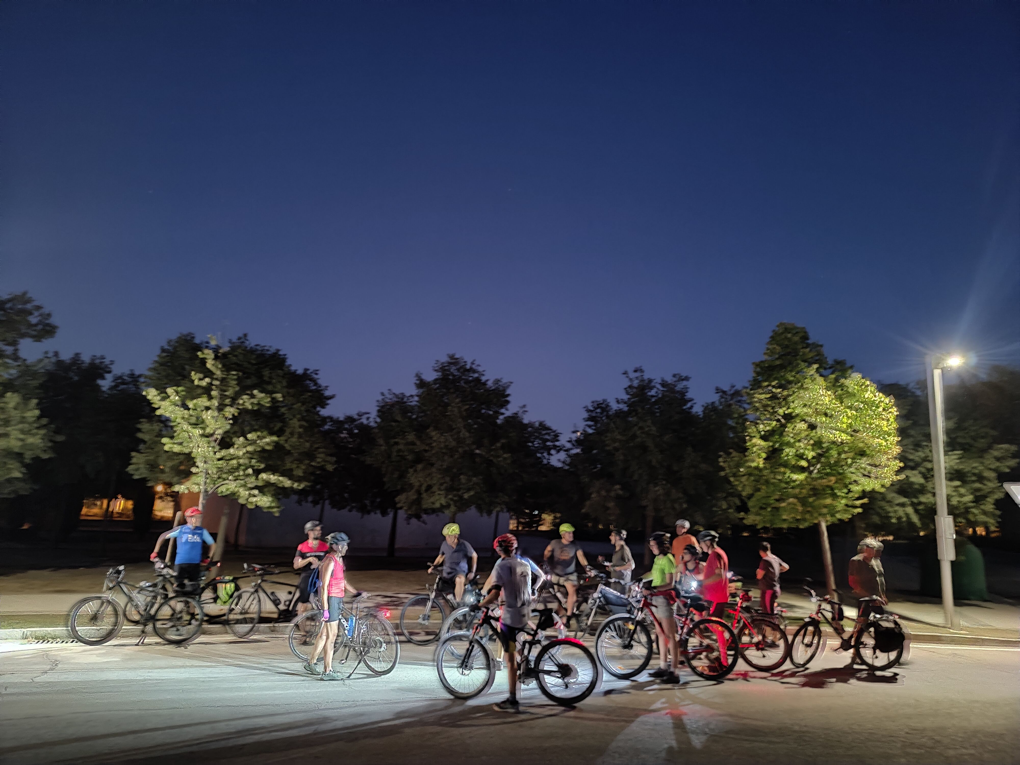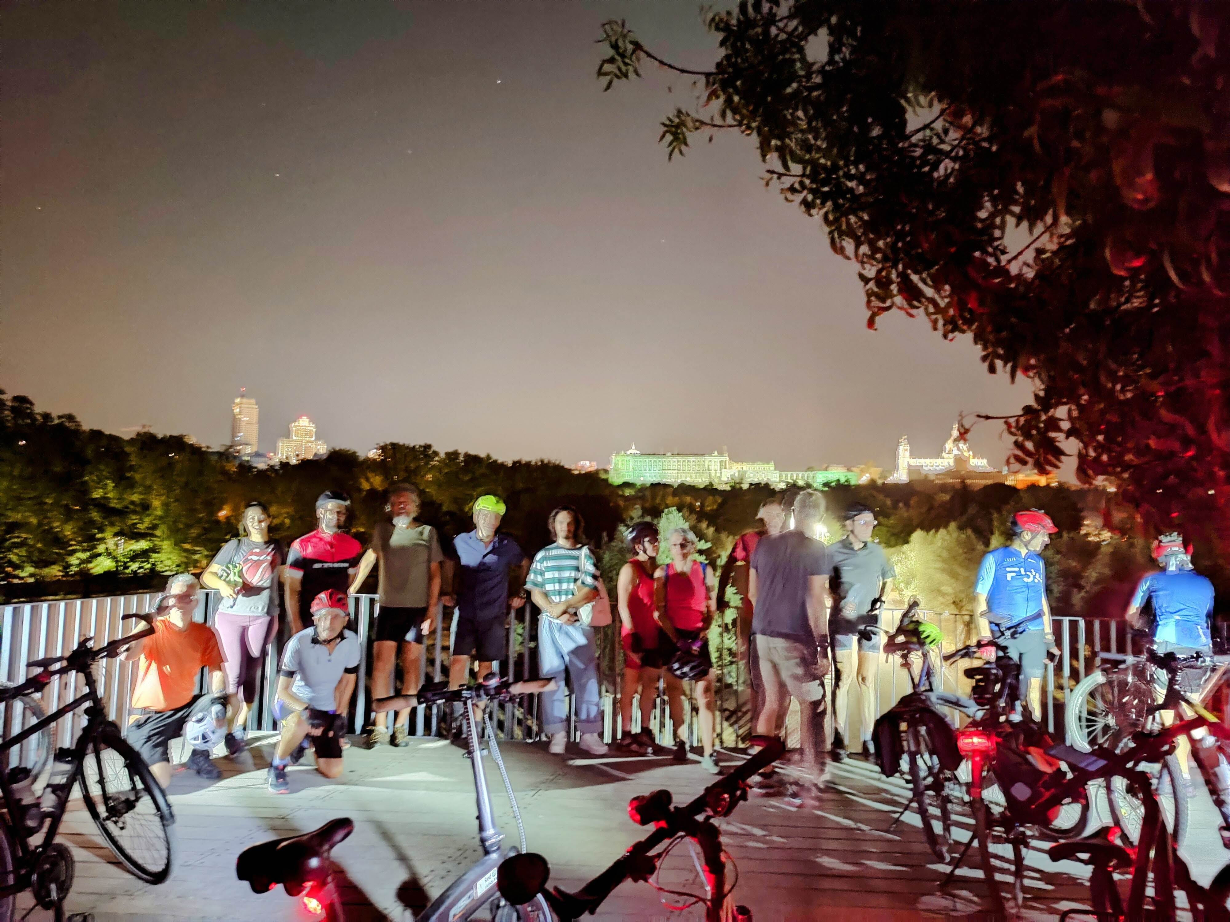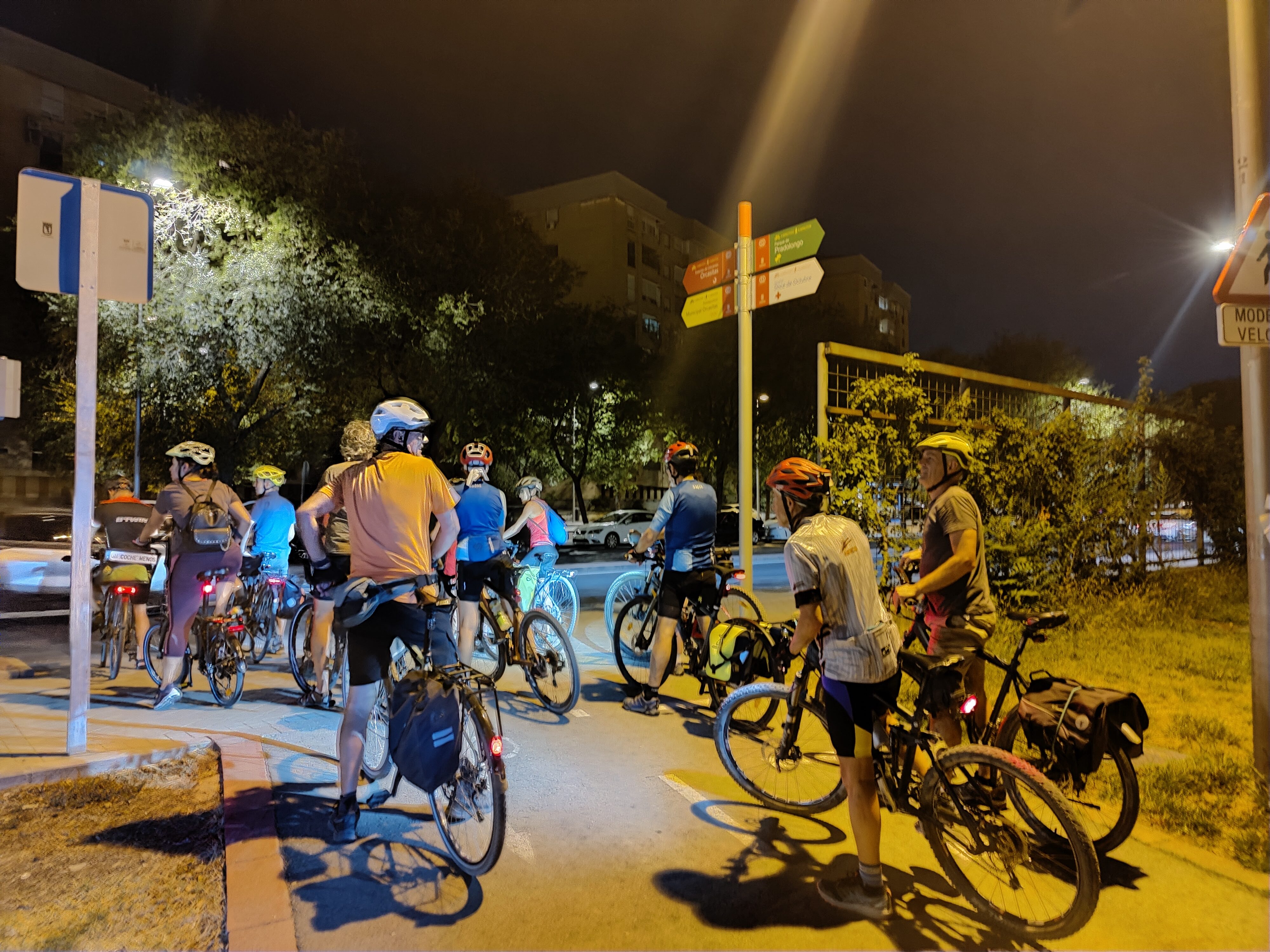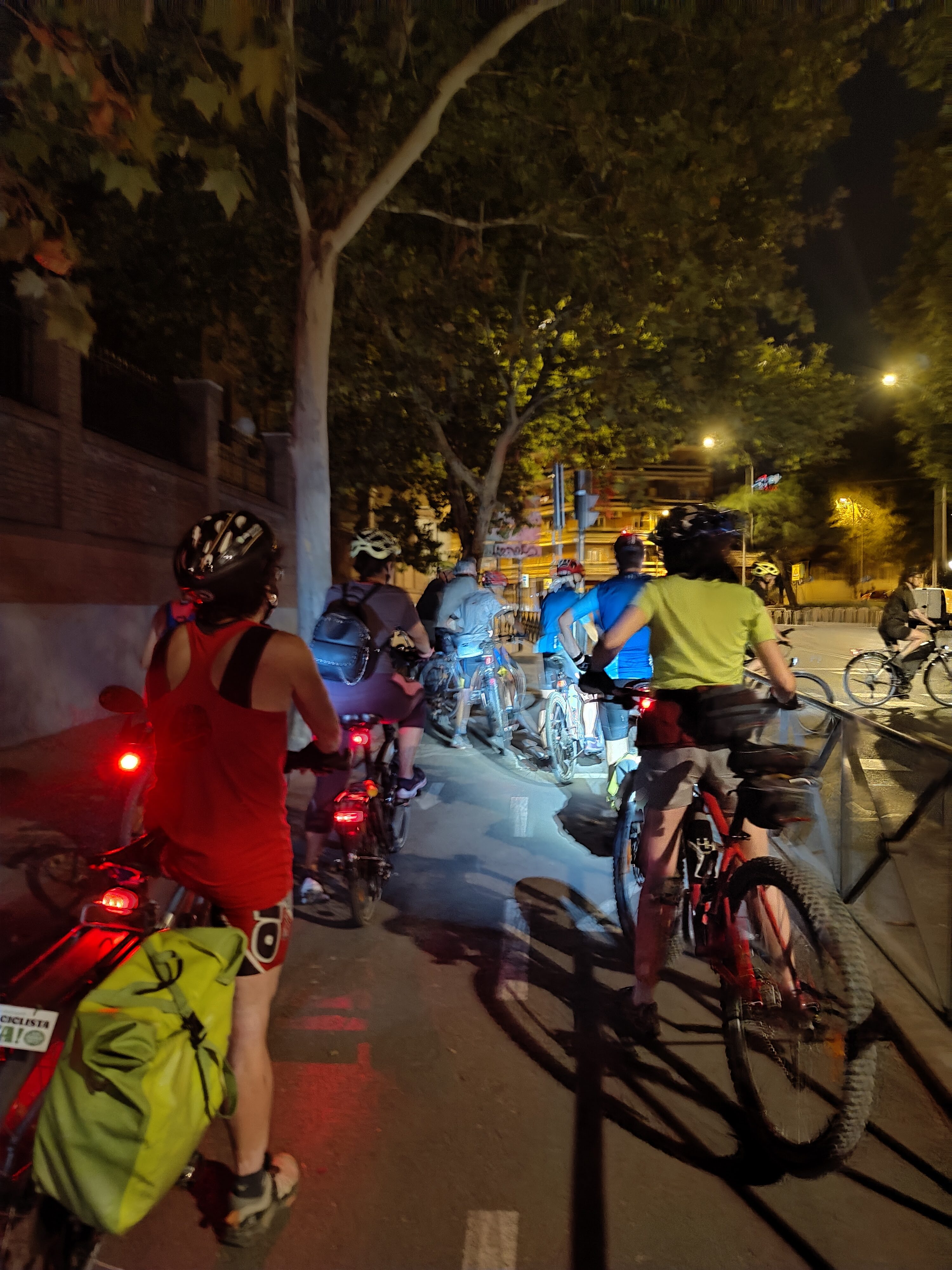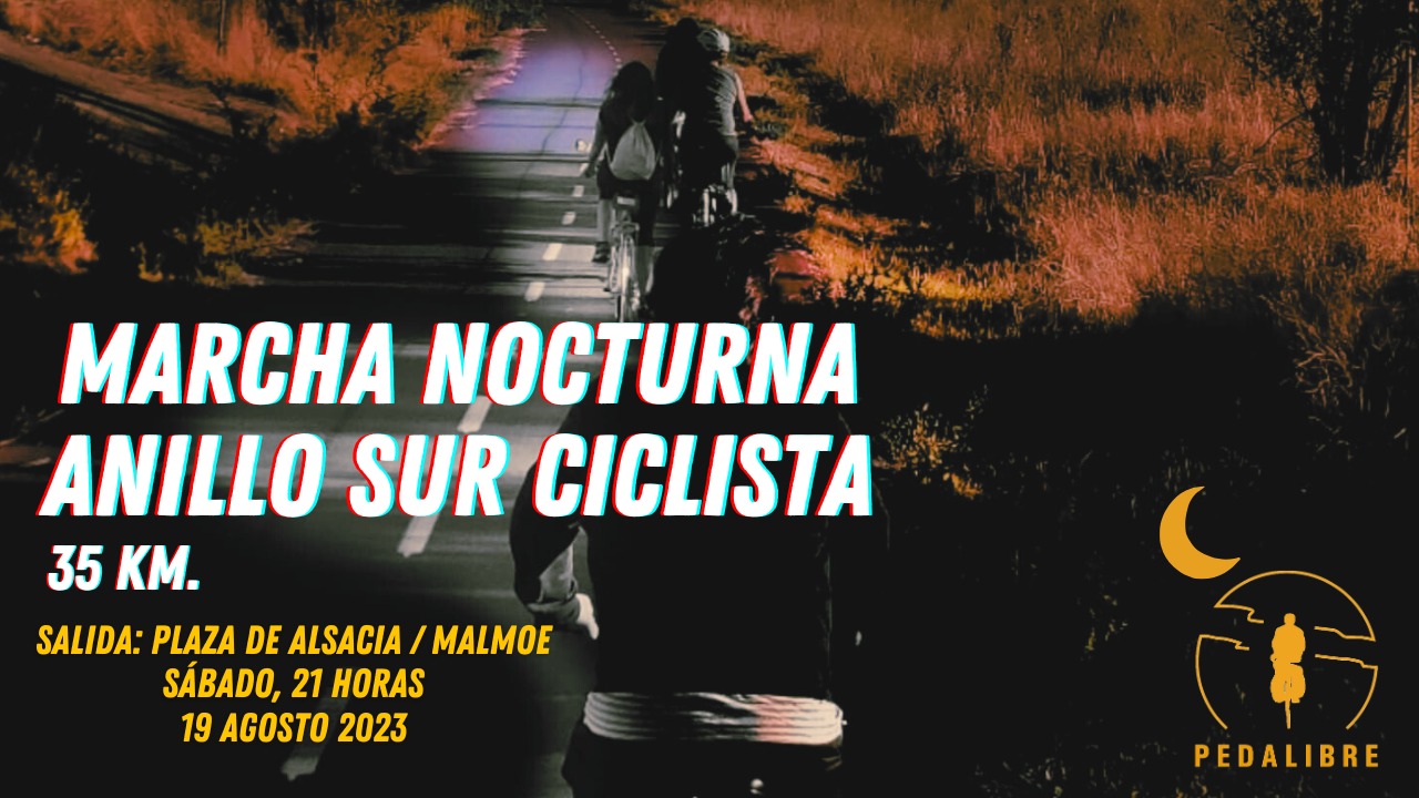 Vuelta Nocturna en bici de unos 35 km al Anillo Verde Ciclista en su parte sur, en el sentido de la rotación de las agujas del reloj. Saldremos desde el barrio de las Rosas hasta Principe Pío siguiendo el anillo ciclista por el tramo sur con el propósito de disfrutar de un Madrid tranquilo aprovechando la temperatura nocturna. Sólo se pide a las personas participantes que vengan a pasarlo bien, pero se recuerda que están obligados a cumplir todas las normas de circulación y que participan bajo su propia responsabilidad.