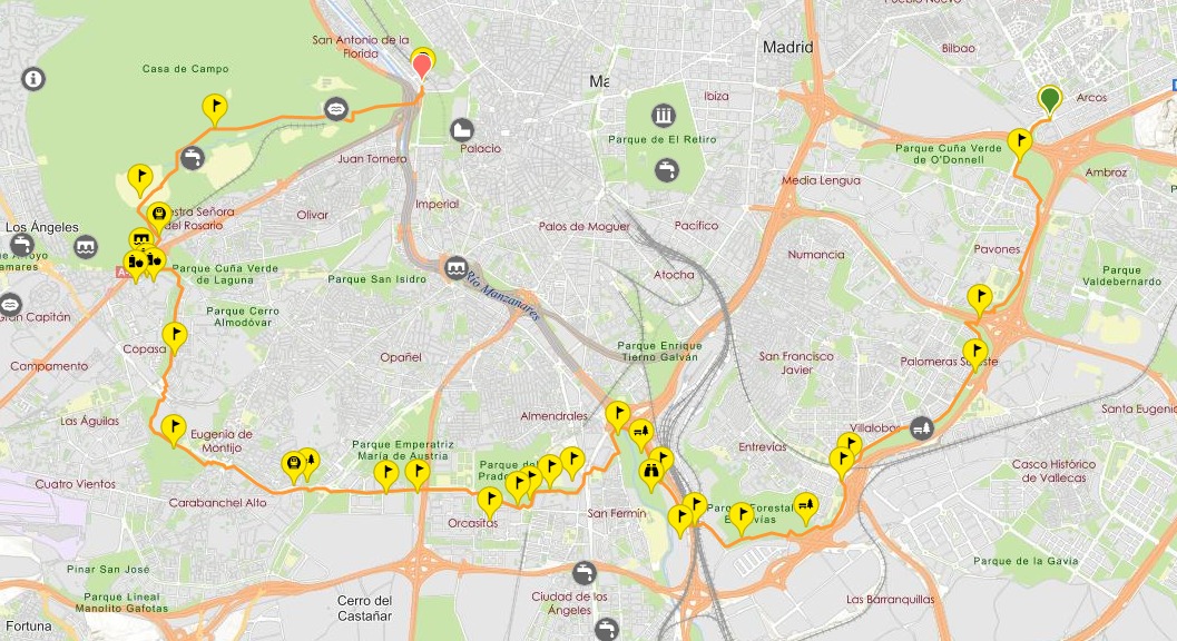 Recordad que el recorrido es tranquilo y sin prisas, en su mayoría transcurre por el trazado del Anillo Verde, salvo algunos tramos por calzada o rutas alternativas. Pasaremos cerca de estaciones de metro por si alguien quiere abandonar la marcha por cualquier motivo.