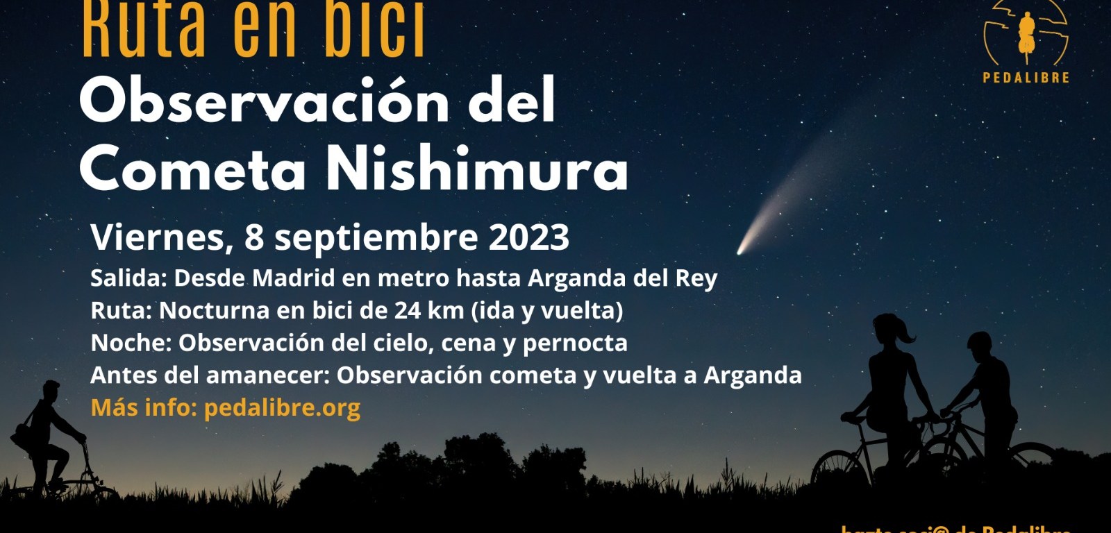 El cuerpo celeste conocido oficialmente como C/2023 P1 probablemente se podrรก ver a simple vista a su paso por la รณrbita solar. Para ello utilizaremos metro y bici hasta un lugar indeterminado en las afueras de la ciudad de Arganda del Rey. Este cometa avanza aumentando su brillo cada dรญa por lo que probablemente serรก perceptible a simple vista la noche del 8 al 9 de septiembre, siempre que el cielo estรฉ despejado.