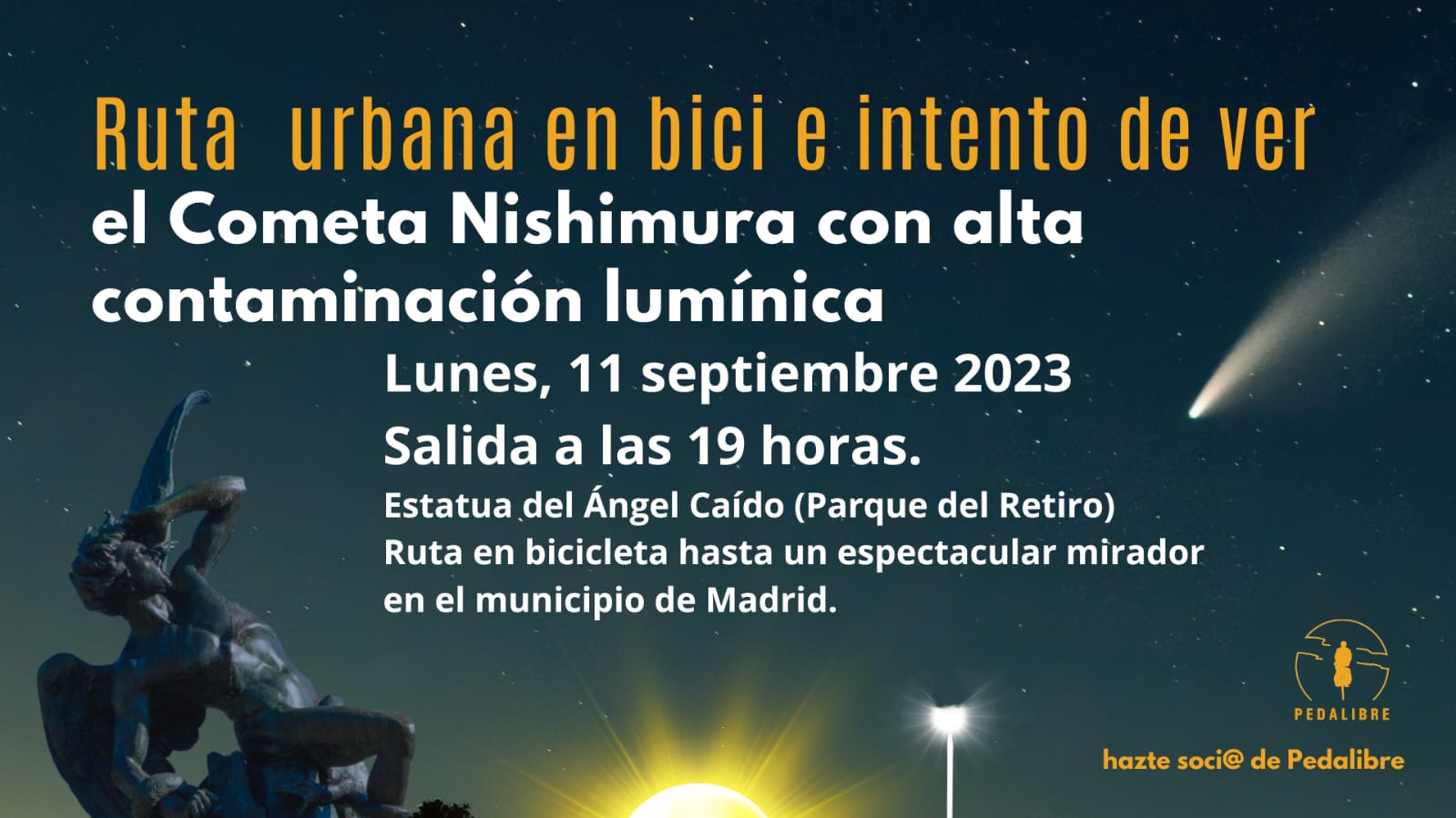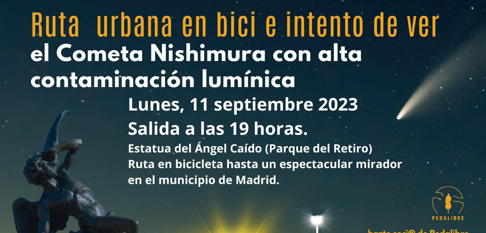 Una última oportunidad y única de ver el paso del cometa. Será difícil verlo debido a la alta contaminación lumínica de Madrid, aún así, no perdemos la esperanza. Haremos una segunda ruta en bici con este fin, esta vez hasta un espectacular mirador de nuestro municipio. Se recomienda llevar prismáticos, ganchos para atar las bicis y, también, bebida y comida quienes lo deseen. Saldremos a las 19 horas desde donde era el lugar de quedadas de la Asociación Pedalibre allá por los años ochenta, la estatua del Ángel Caído en el parque del Retiro.