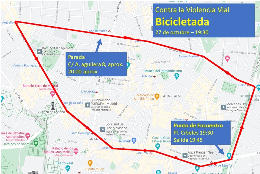 El recorrido pasará por uno de los puntos en los que hubo atropellos: C/ Alberto Aguilera, 8. Aquí, haremos una parada para denunciar públicamente y de forma gráfica la violencia vial que a menudo sufrimos los ciclistas y la ciudadanía en general, por desalmados que utilizan el coche como arma contra los demás.
