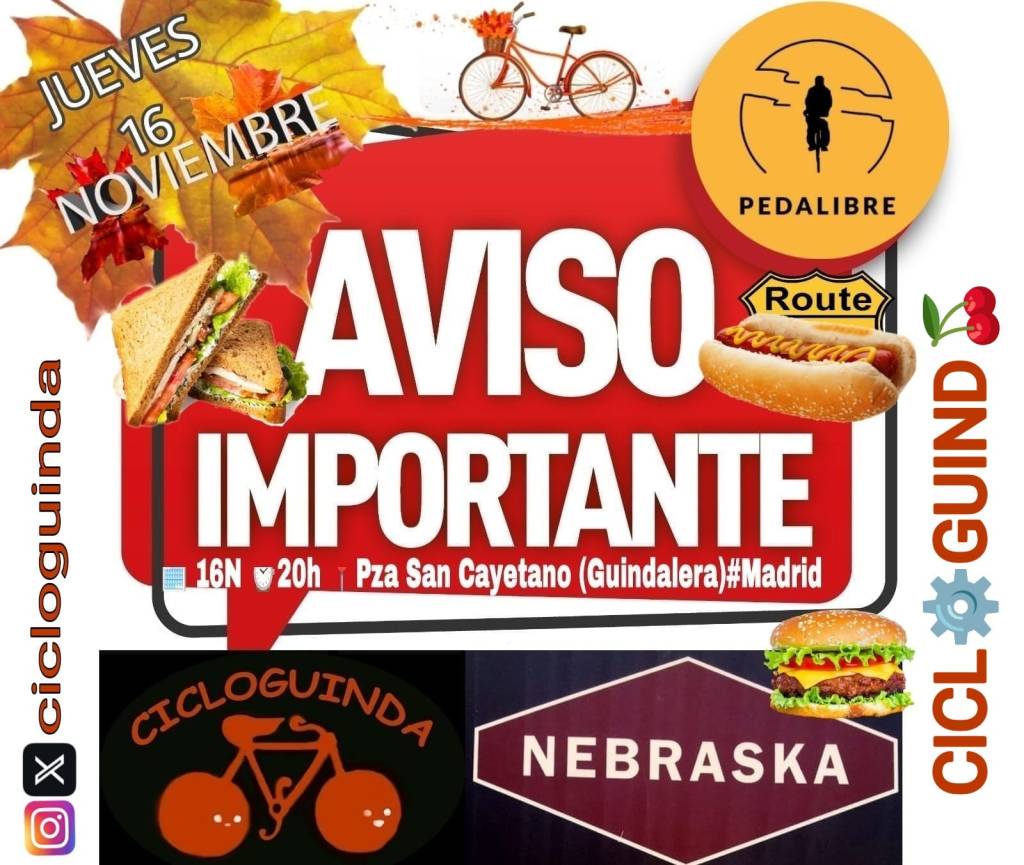 La Cicloguinda desde 2015 lleva haciendo recorridos en grupo, principalmente por los lugares más emblemáticos del barrio de la Guindalera y limítrofes. También se acerca al resto de barrios de la ciudad y a localidades cercanas a Madrid. A veces, se ha llegado a utilizar algún equipo de sonido durante el recorrido. Los lugares, localidades, establecimientos que se recorren son muy variados y van desde la desaparecida sala Rockola a parques como el de Berlín, el Auditorio nacional de Música, proyectos de despensas solidarias o rutas que enfilan hasta llegar al aeropuerto de Barajas, por ejemplo. Los finales suelen ser una parada del alegre pelotón en algún lugar majo propuesto por alguien del grupo: el Rock-bar La Panadería, el Bar Gredos, el Docamar con sus famosísimas patatas a la brava, el Arrebato Bar o con visitas a otros colectivos ciclistas. En fin, son actos de militancia a la bici y a la amistad.